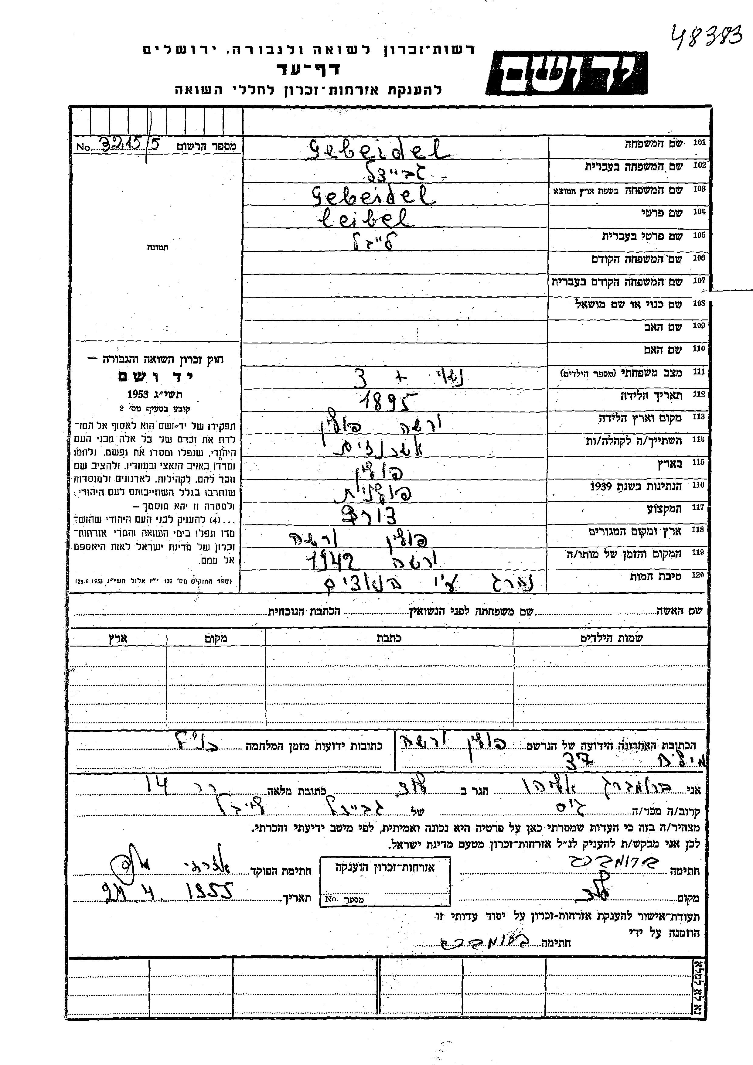 Leibel Gebeidel wurde im Jahr 1895 in Warsaw, Polen geboren. Er war Goldschmied/-in. Vor dem Zweiten Weltkrieg lebte er in Warsaw, Polen. Während des Krieges war er in Warsaw, Polen.