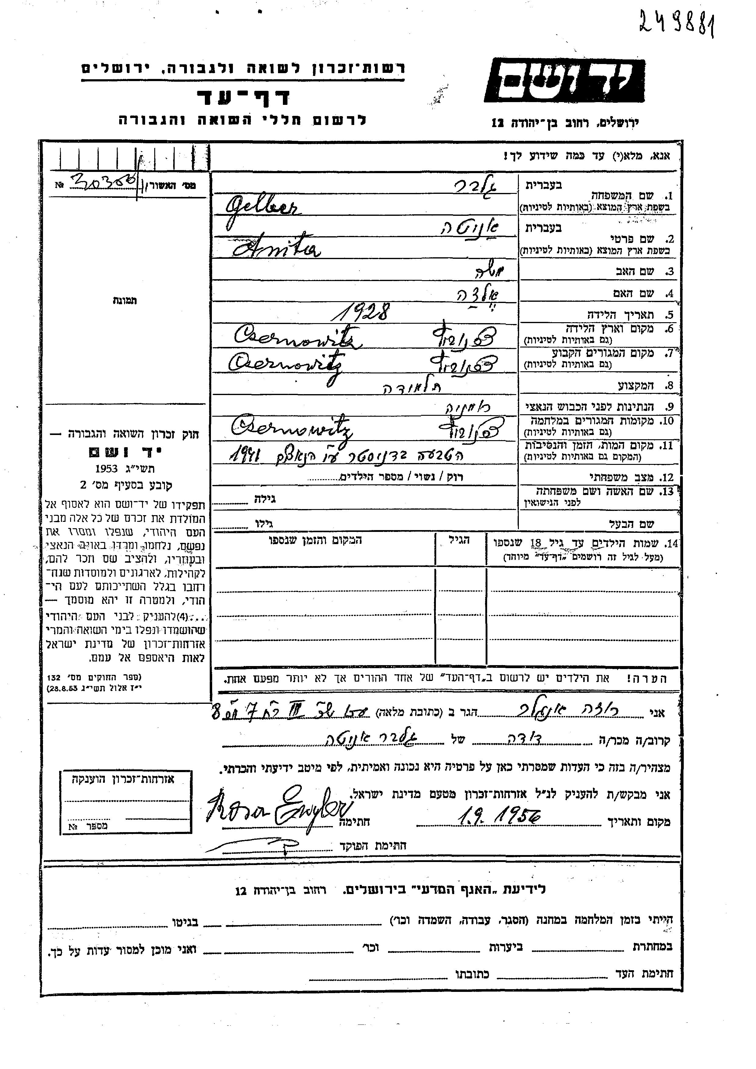 Gelber Anita 1928 Czernowitz, Rumänien Gedenkblatt