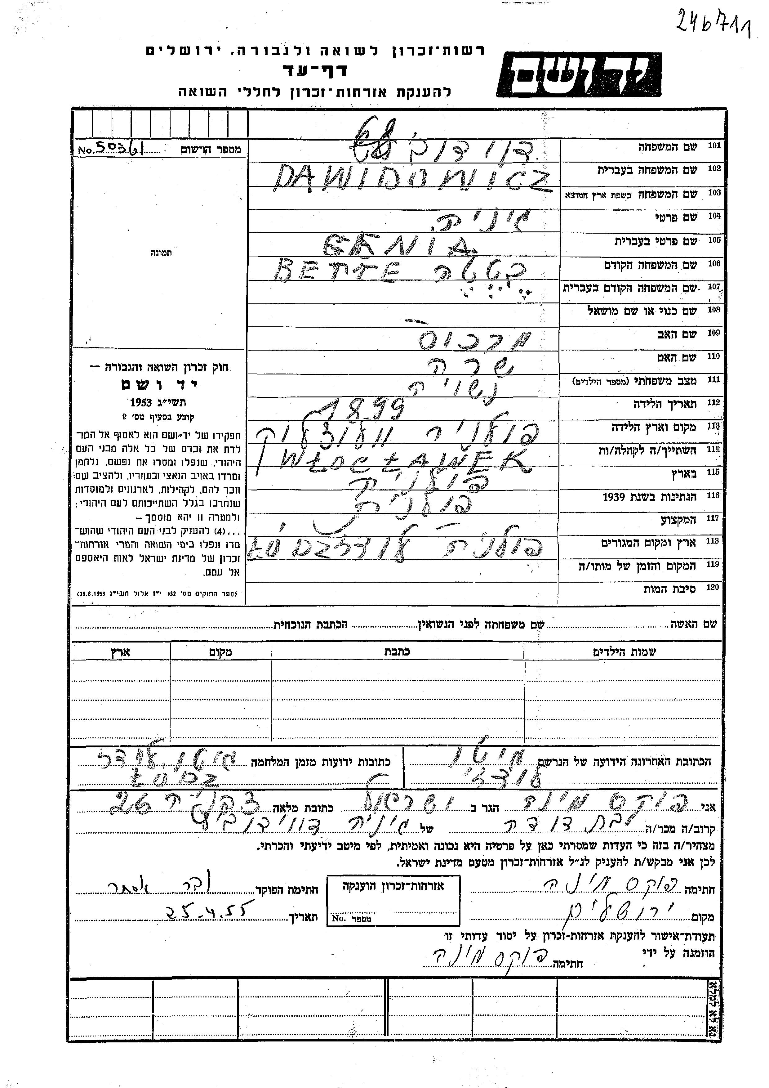 Genia Dawidowicz, geb. Bette wurde im Jahr 1899 geboren. Sie war die Tochter von Markus und Sara. Vor dem Zweiten Weltkrieg lebte sie in Wloclawek, Polen.