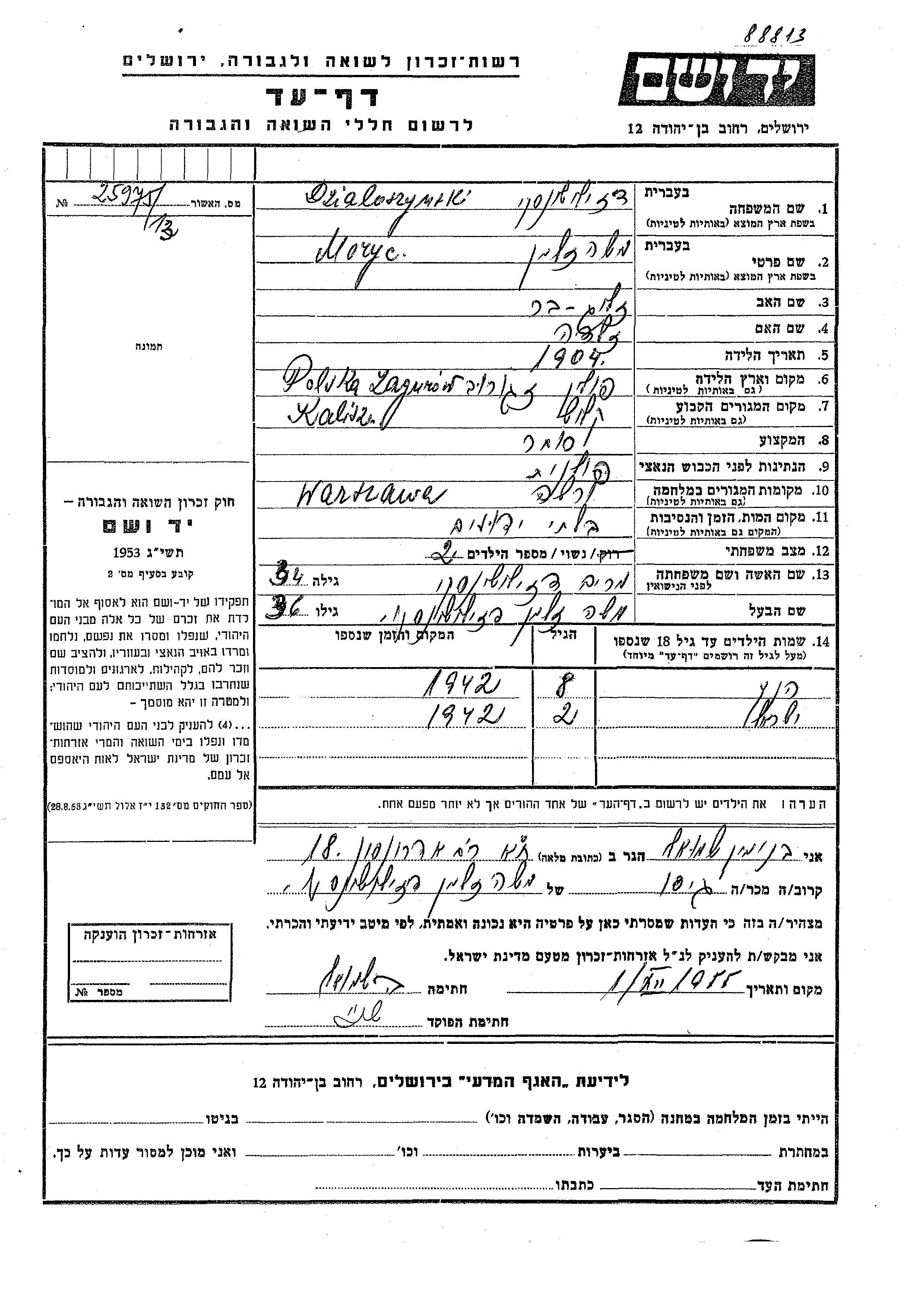 Moryc Moshe Zalman Dzialoszynski wurde im Jahr 1904 in Zagrova, Polen geboren. Er war der Sohn von Zelig Ber und Zelda. Er war Kaufmann/-frau und mit Miriam Verheiratet. Vor dem Zweiten Weltkrieg lebte er in Kaluszyn, Polen. Während des Krieges war er in Warsaw, Polen.
