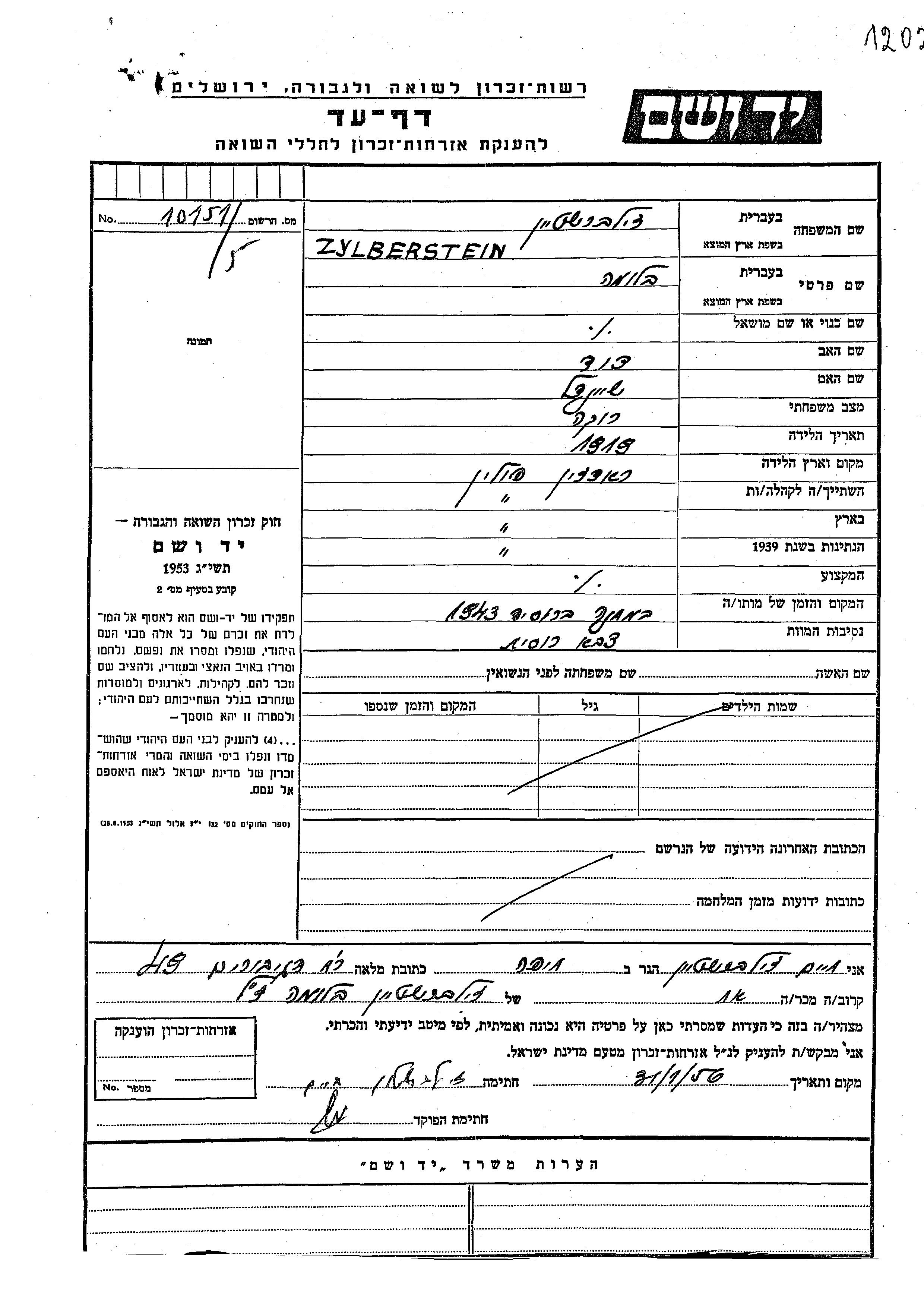 Bluma Zylberstein wurde im Jahr 1919 in Radzyn, Polen geboren. Sie war die Tochter von David und Sheindl. Sie war Ledig. Vor dem Zweiten Weltkrieg lebte sie in Radzyn, Polen.