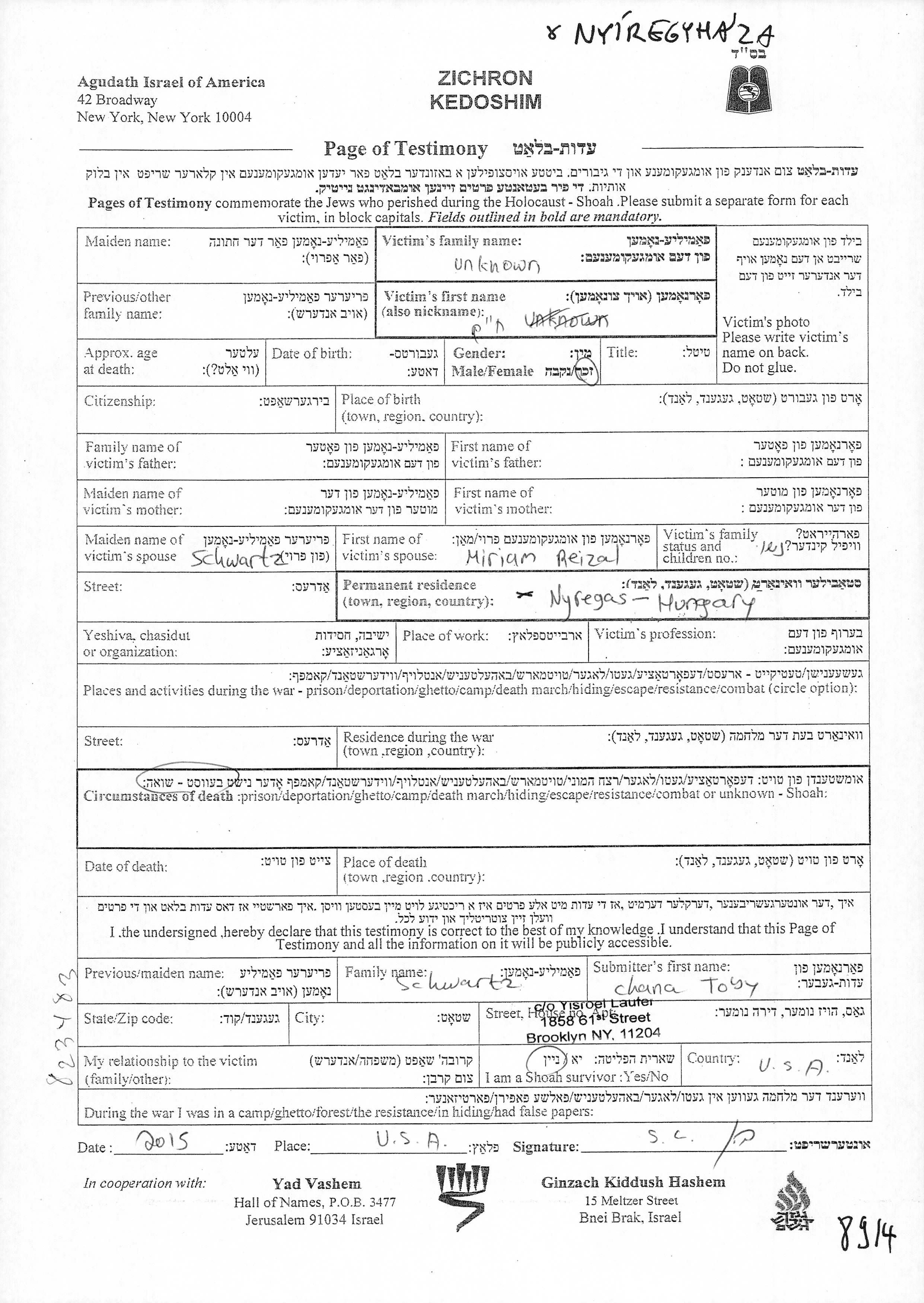Chaim Name unbekannt. Er war mit Miriam Reizal, geb. Schwartz Verheiratet. Vor dem Zweiten Weltkrieg lebte er in Nyiregyhaza, Ungarn.