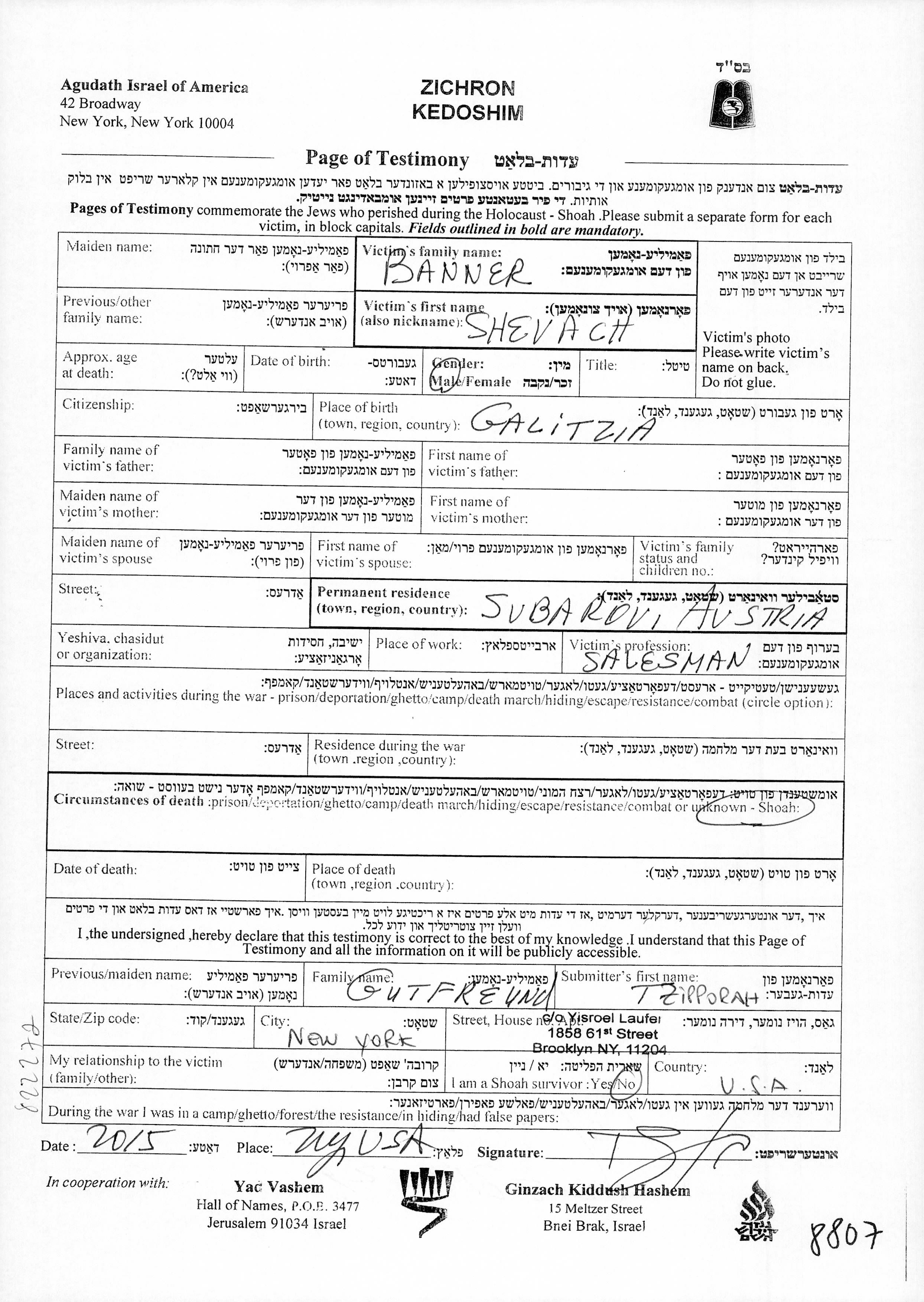 Shevach Banner wurde in Galizien Region, Polen geboren. Er war Handelsvertreter/in. Vor dem Zweiten Weltkrieg lebte er in Undeciphered Place, Österreich.