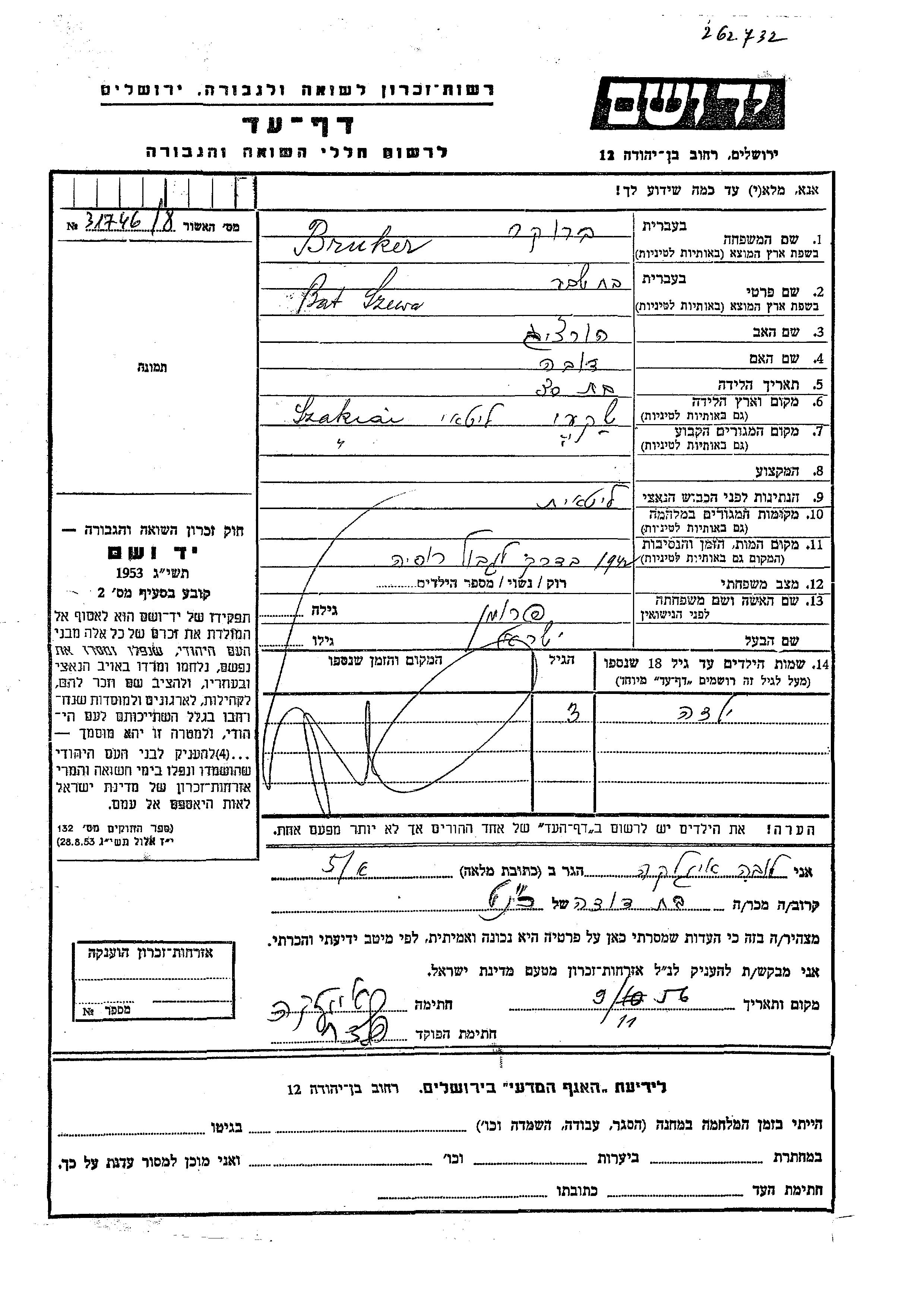 Bat Szewa Bruker, geb. Fruman wurde in Szaki, Litauen geboren. Sie war die Tochter von Hortzig und Doba. Sie war mit Yisrael Verheiratet. Vor dem Zweiten Weltkrieg lebte sie in Szaki, Litauen.