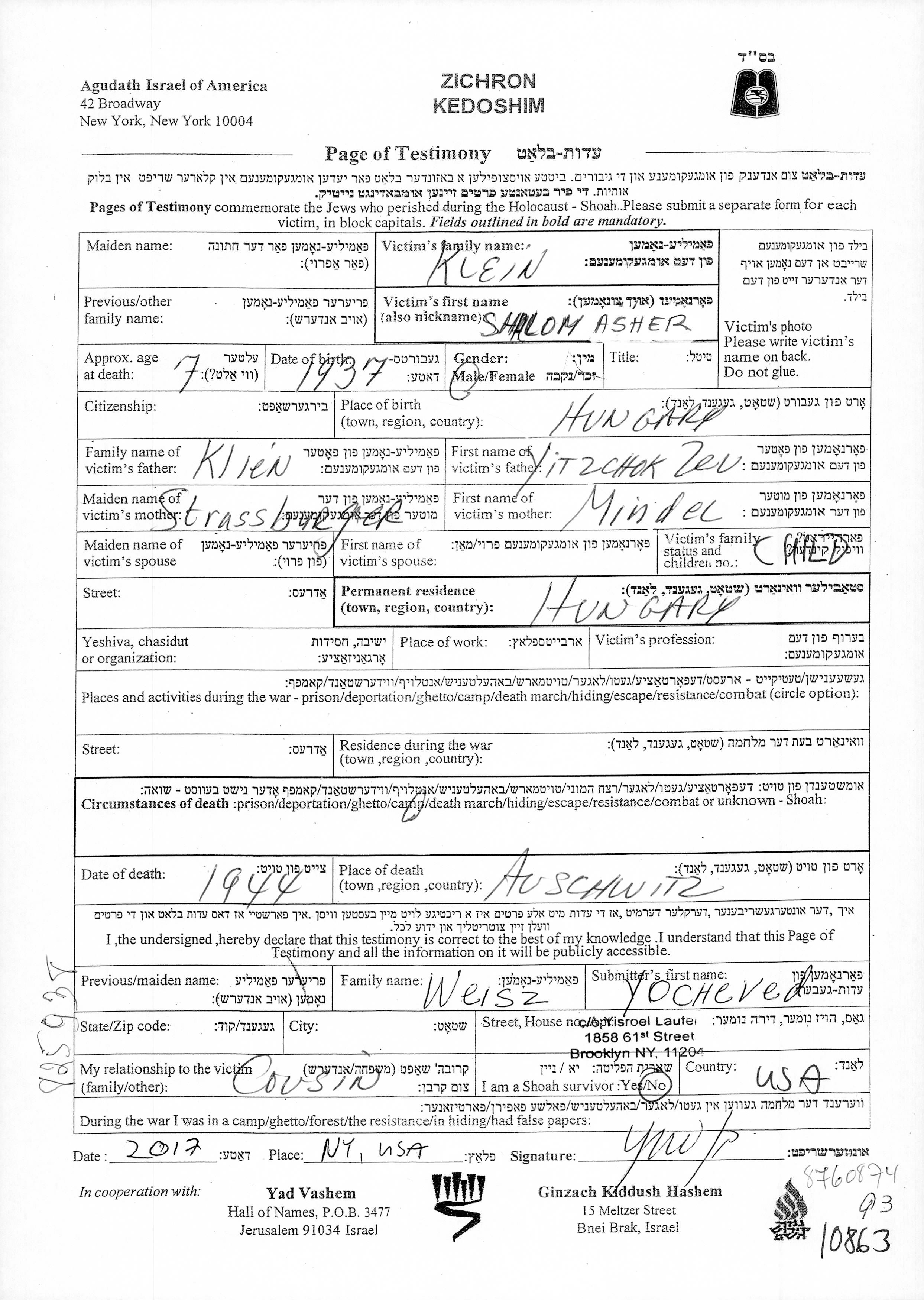 Shalom Asher wurde in der Schoah ermordet. Todesort: Auschwitz, Polen im Jahr 1944.