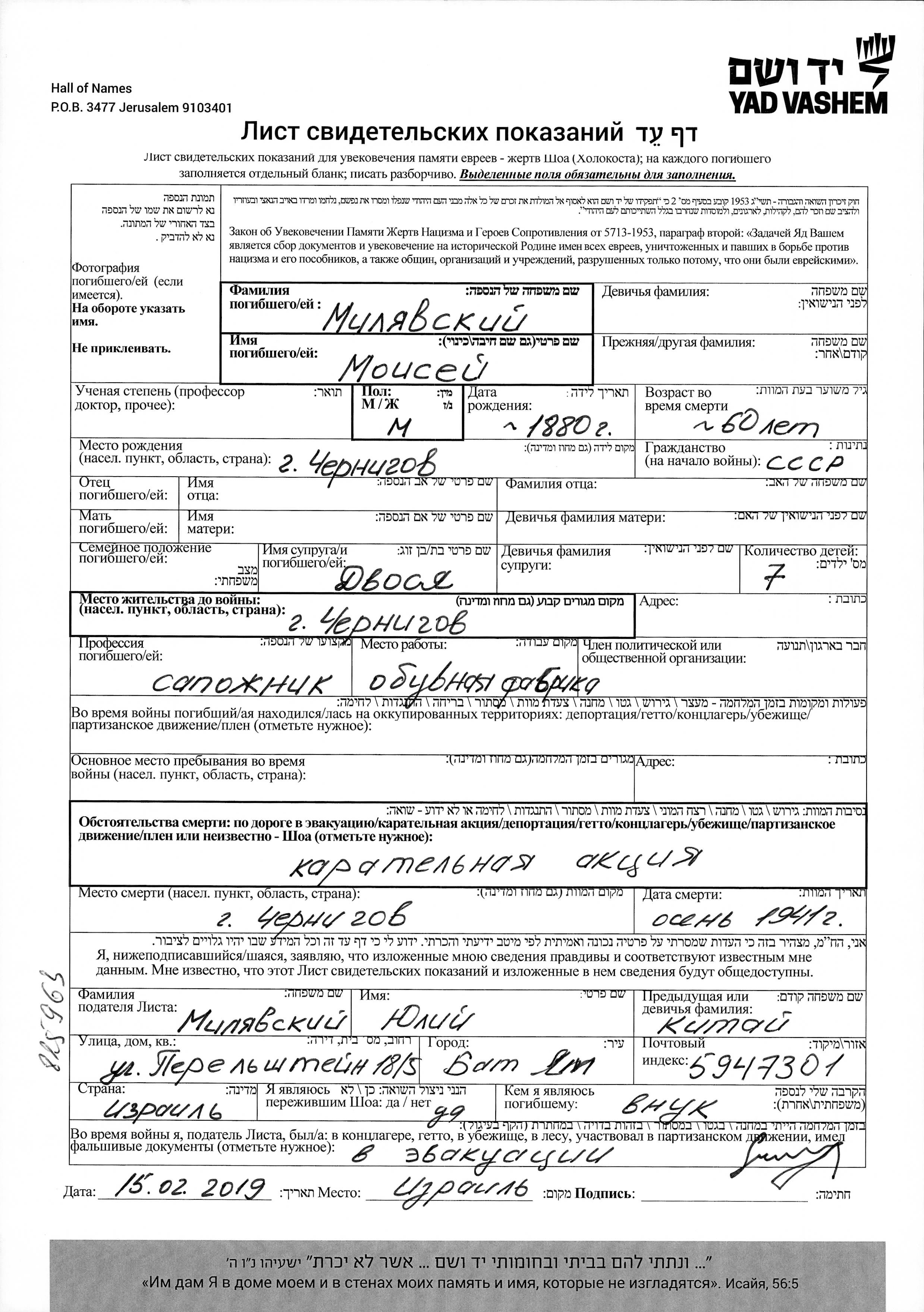 Moisey wurde in der Schoah ermordet. Todesort: Chernigov, Ukraine (UdSSR) im Jahr 10/1941.