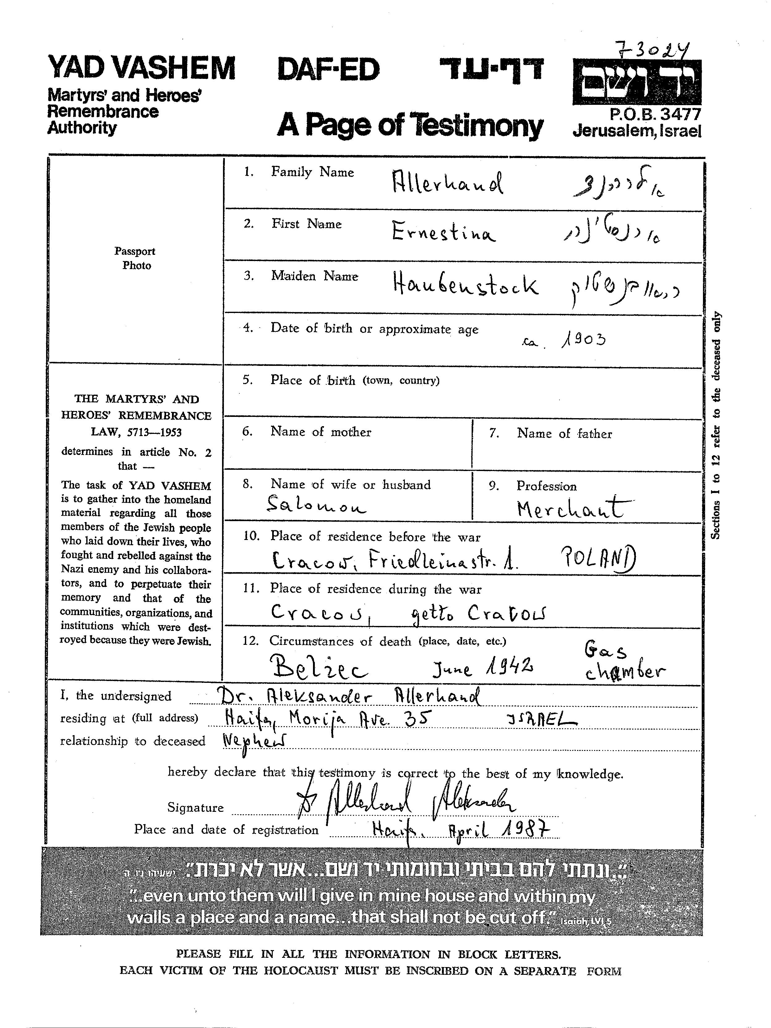 Ernestina Allerhand, geb. Haubenstock wurde im Jahr 1904 in Stanislawow, Polen geboren. Sie war Kaufmann/-frau. Vor dem Zweiten Weltkrieg lebte sie in Krakow, Polen.