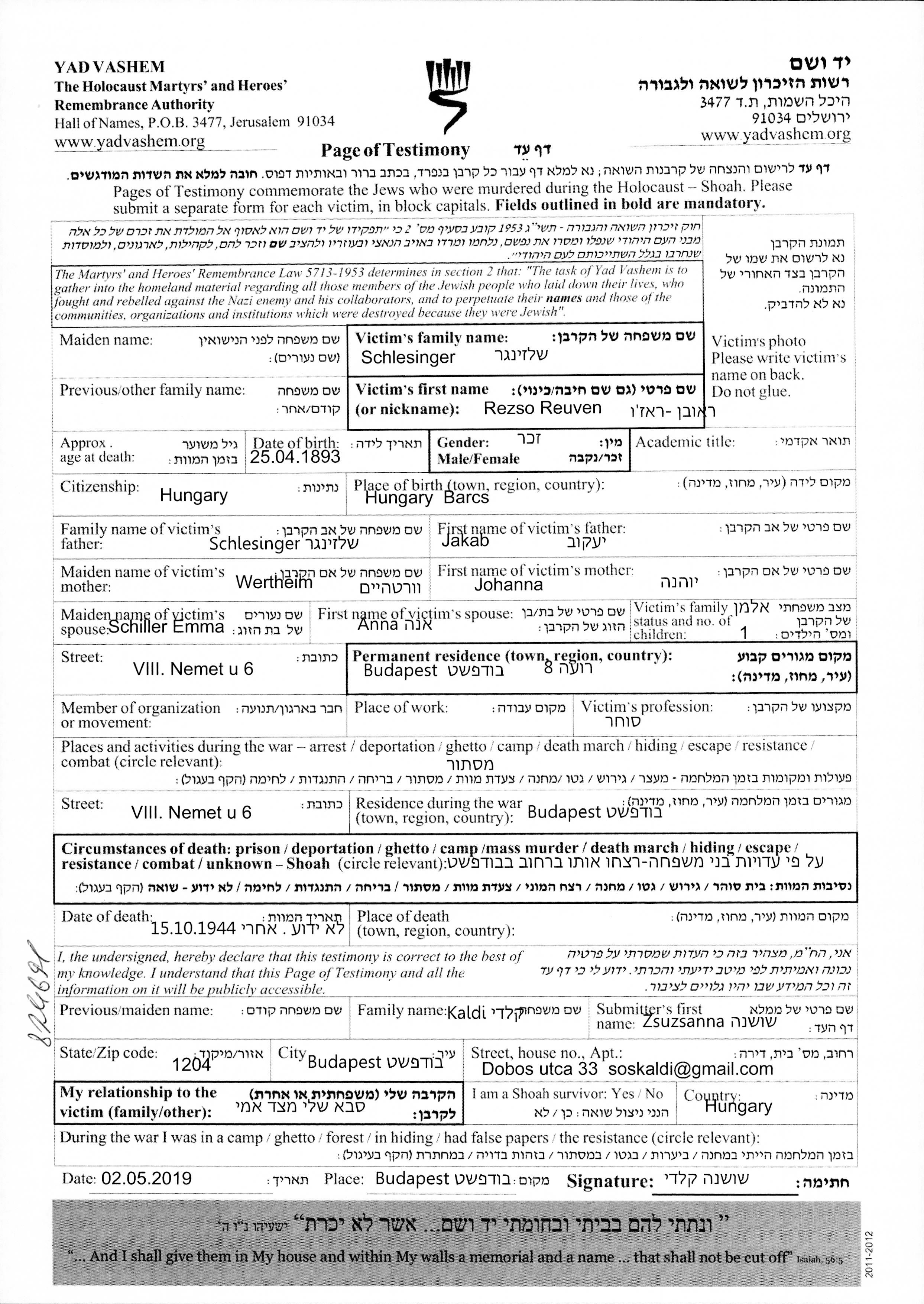 Rezső Reuven wurde in der Schoah ermordet. Todesort: Budapest, Ungarn im Jahr 15/10/1944.