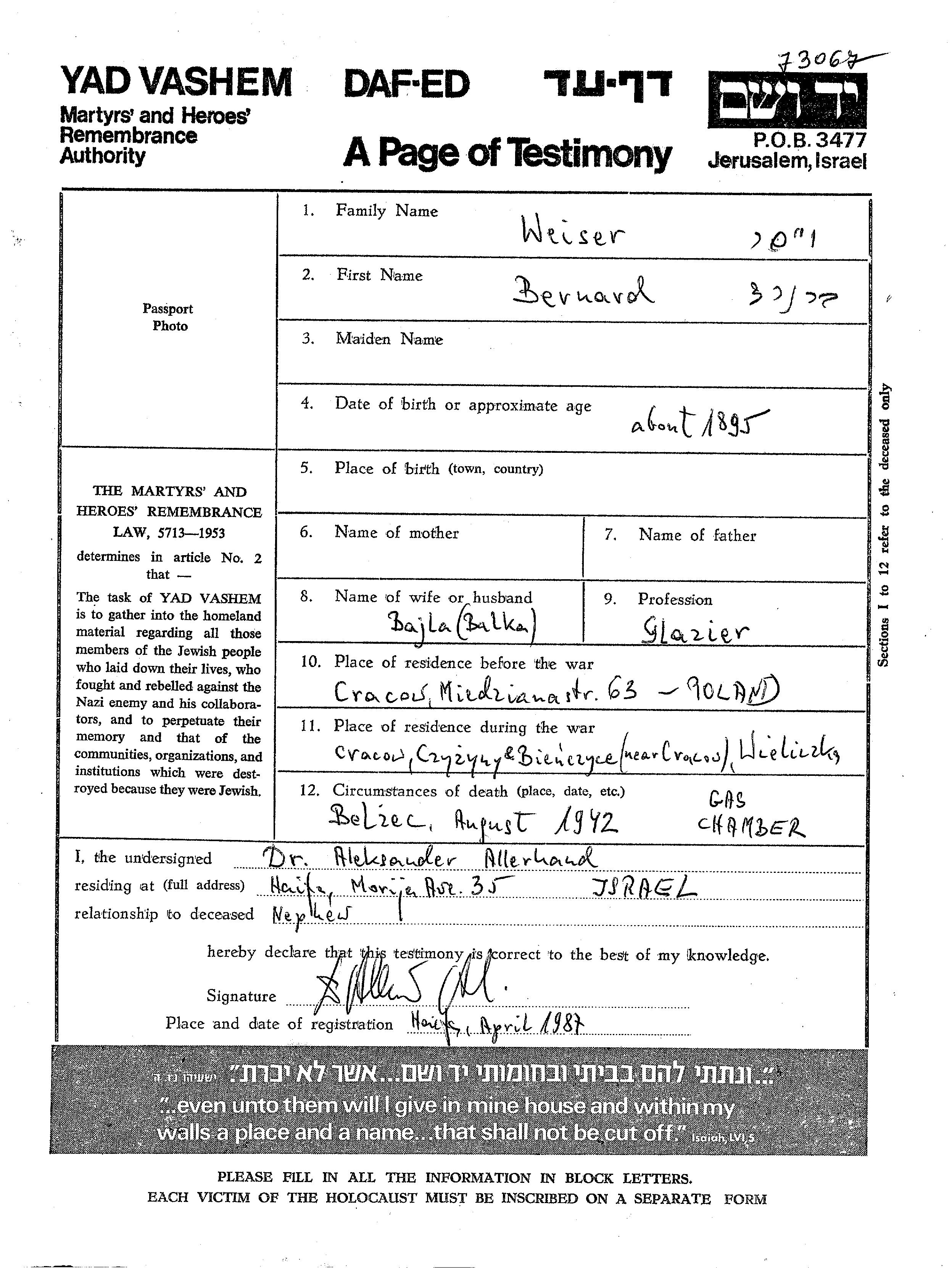 Bernard Weiser wurde im Jahr 1895 geboren. Er war Glaser/-in. Vor dem Zweiten Weltkrieg lebte er in Krakow, Polen.