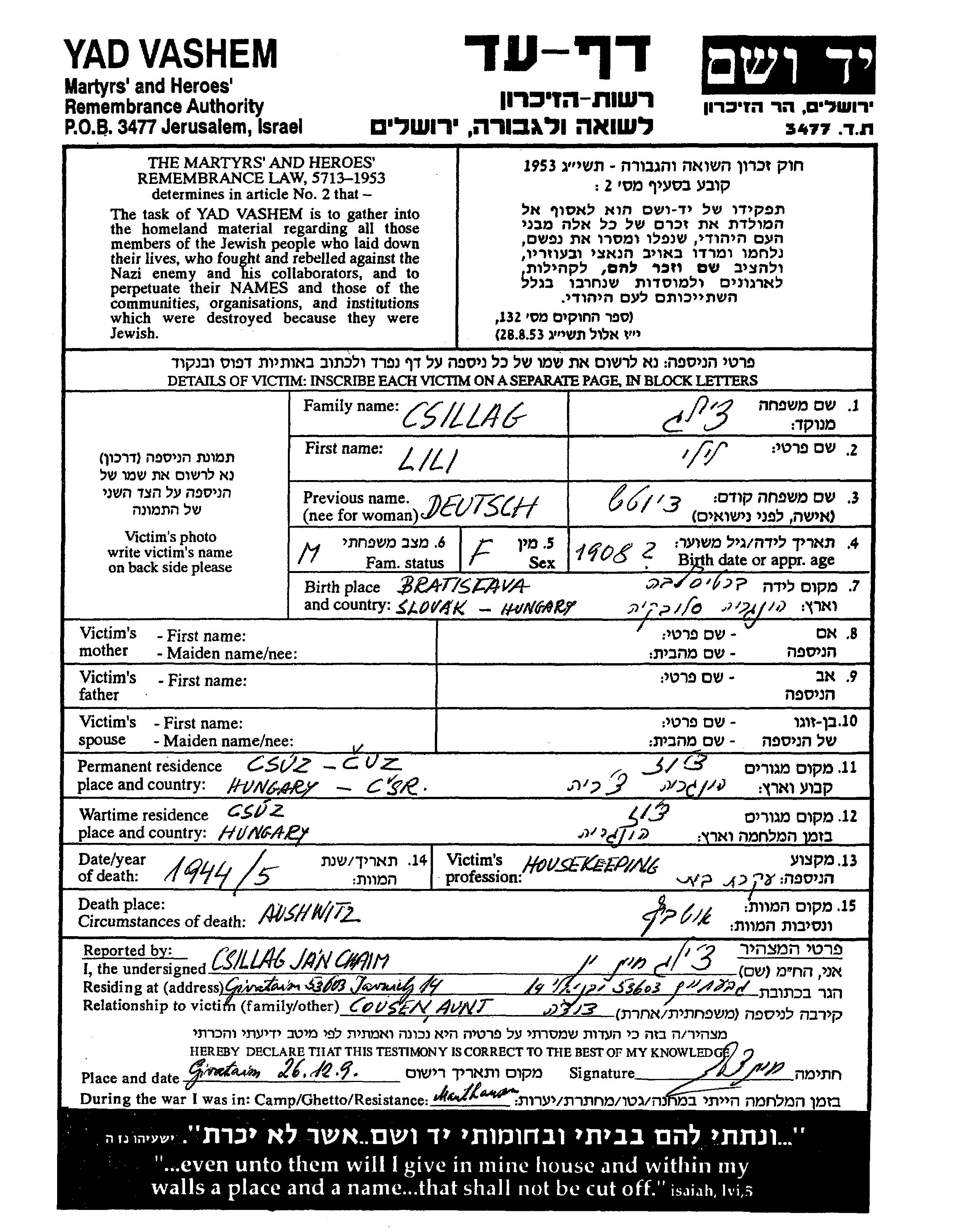 Lili Csillag, geb. Deutsch wurde im Jahr 1908 in Bratislava, Tschechoslowakei geboren. Sie war Hausfrau und Verheiratet. Vor dem Zweiten Weltkrieg lebte sie in Csuz, Tschechoslowakei. Während des Krieges war sie in Csuz, Tschechoslowakei.