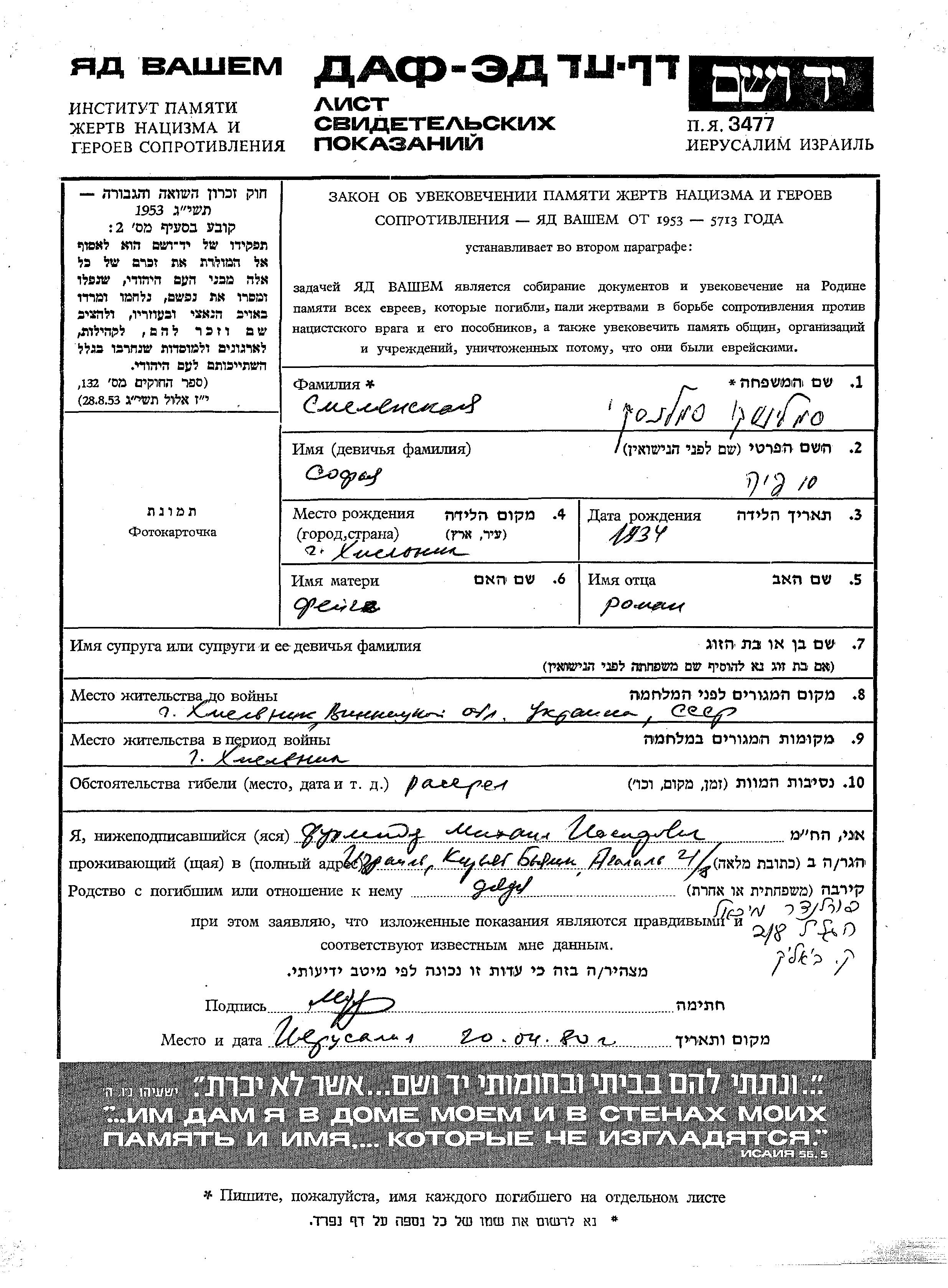 Smelyanskaya Sofya 1934 Khmelnik, Ukraine (UdSSR) Gedenkblatt