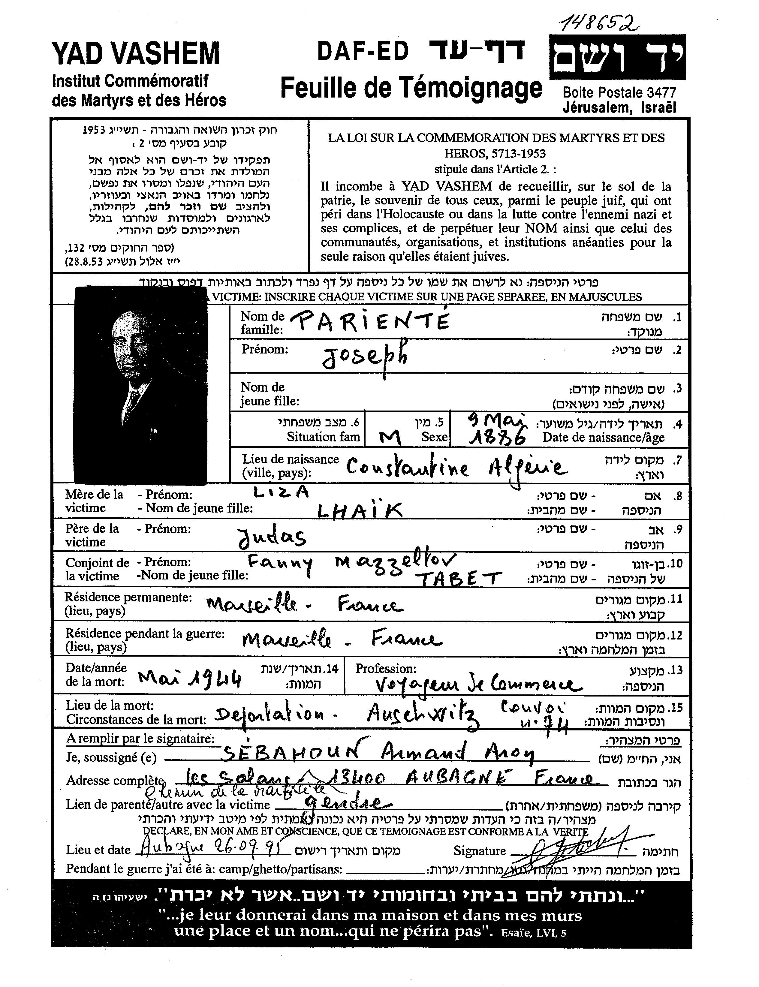 Yosef Pariente wurde im Jahr 1886 in Constantine, Algerien geboren. Er war Vertreter/-in. Vor dem Zweiten Weltkrieg lebte er in Marseille, Frankreich.