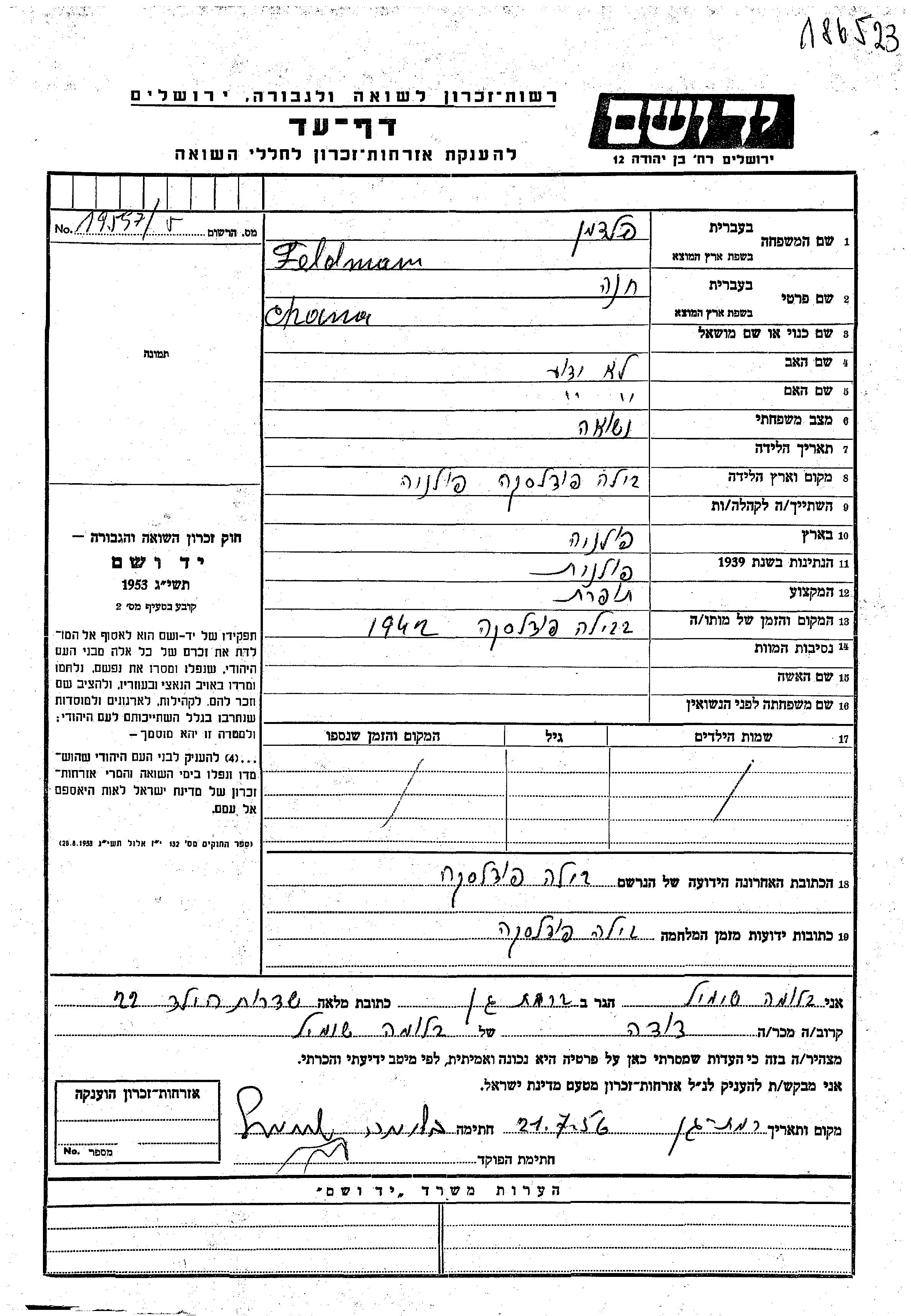 Chana Feldman wurde in Bielsk Podlaski, Polen geboren. Sie war Verheiratet. Vor dem Zweiten Weltkrieg lebte sie in Polen. Während des Krieges war sie in Polen.