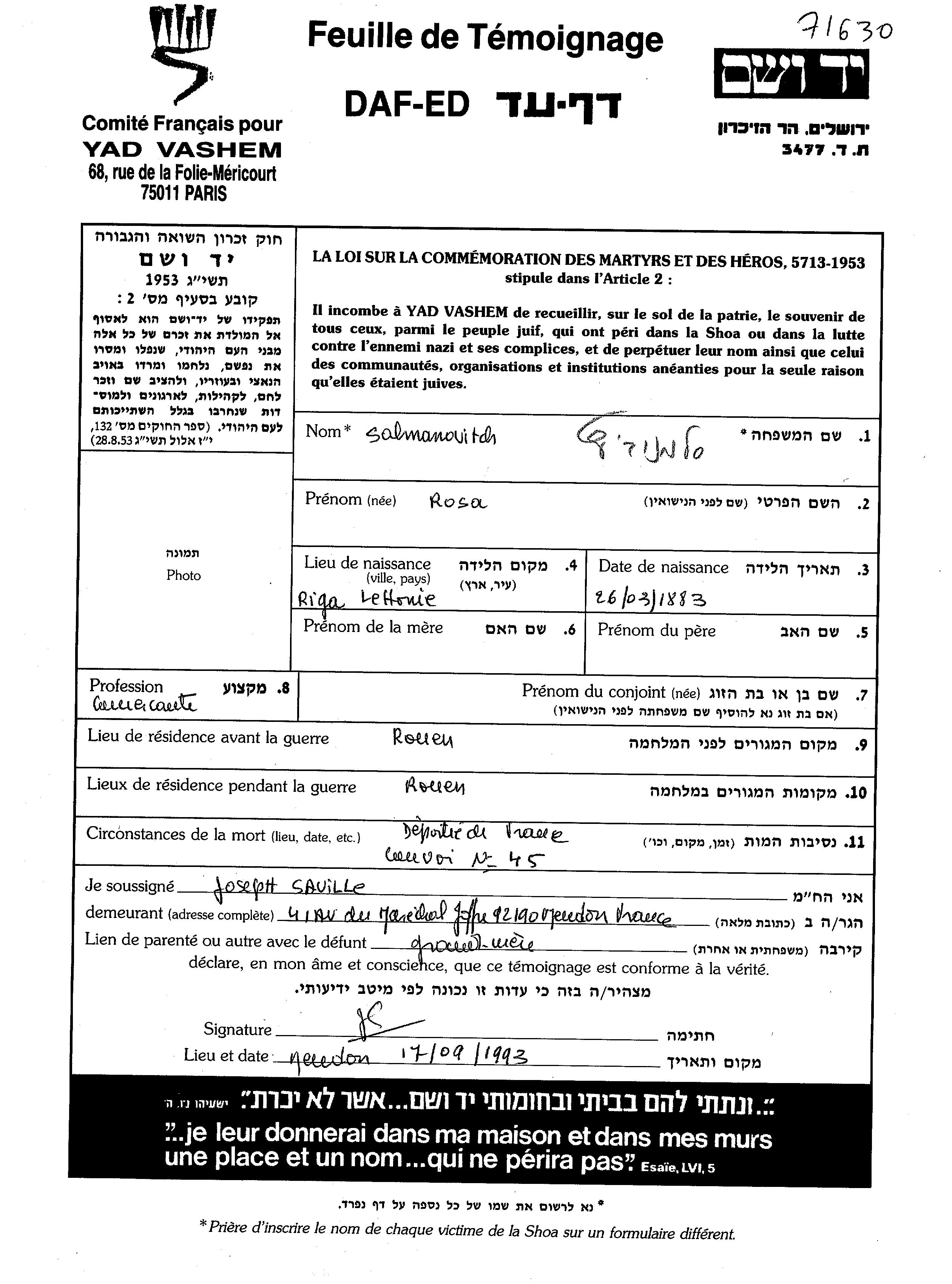 Roza Selmanovitz Salmanowicz wurde im Jahr 1883 in Riga, Lettland geboren. Sie war Kaufmann/-frau. Vor dem Zweiten Weltkrieg lebte sie in Rouen, Frankreich.