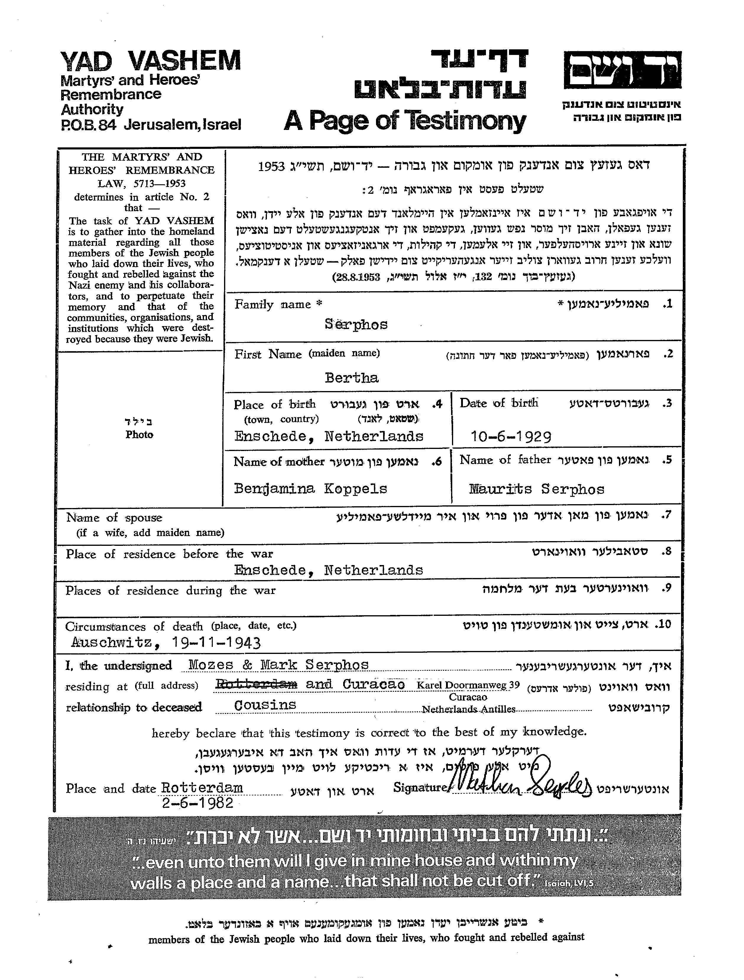 Berta Serphos wurde im Jahr 1929 in Enschede, Niederlande geboren. Vor dem Zweiten Weltkrieg lebte sie in Niederlande.