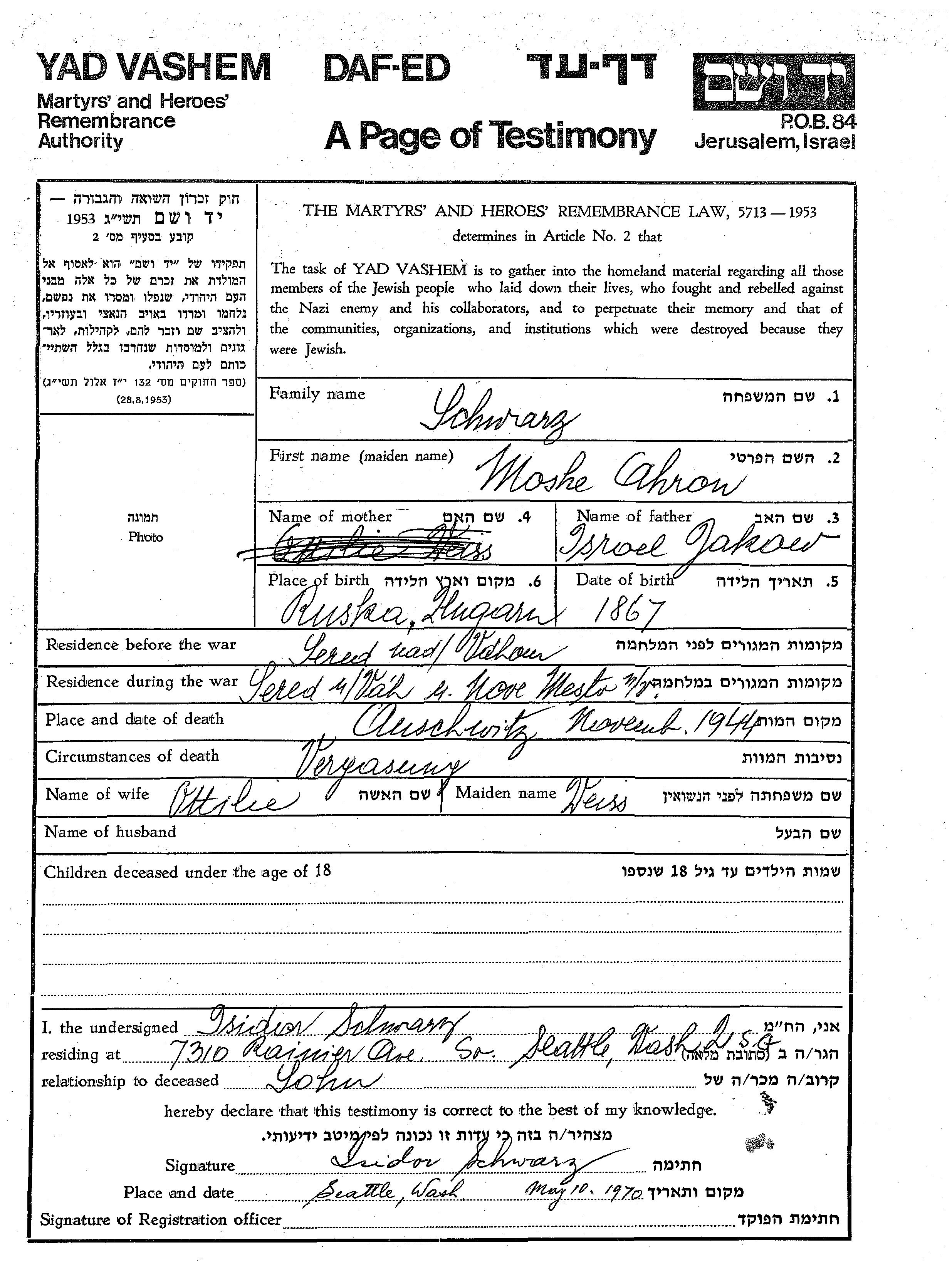 Moshe Ahron Schwarz wurde im Jahr 1867 in Ruska, Tschechoslowakei geboren. Er war der Sohn von Israel Jakow. Er war mit Ottilie, geb. Weiss Verheiratet. Vor dem Zweiten Weltkrieg lebte er in Sered nad Vahom, Tschechoslowakei. Während des Krieges war er in Sered nad Vahom, Tschechoslowakei.