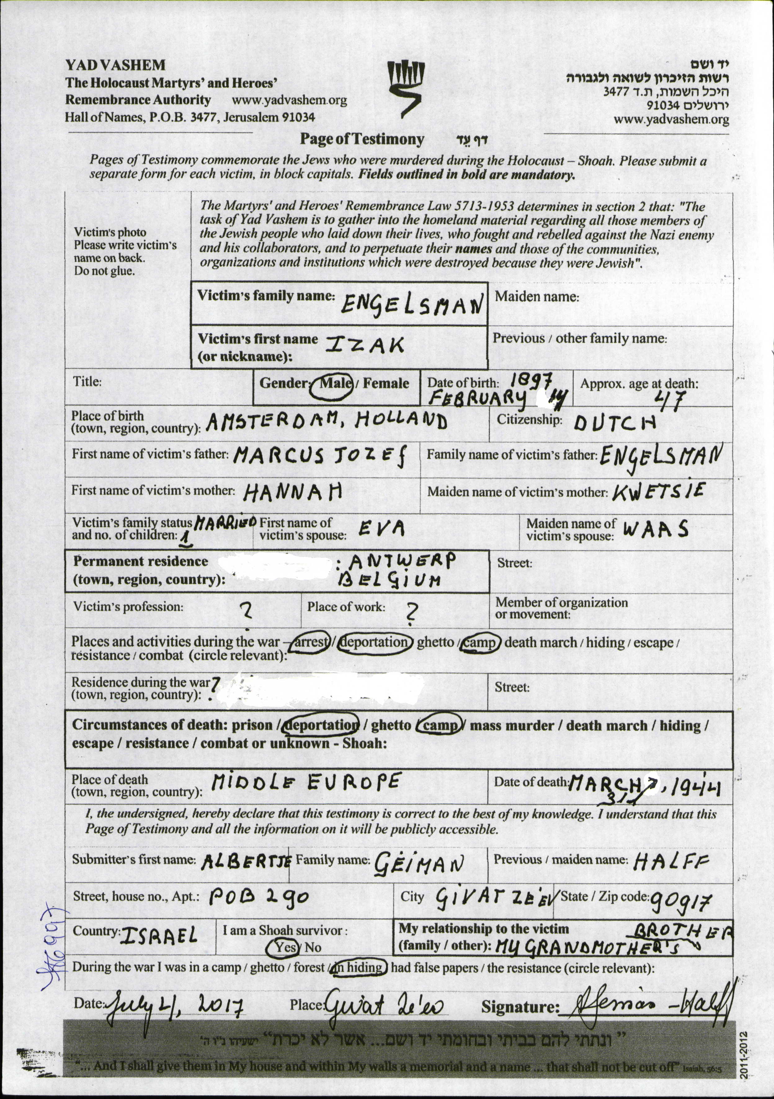 Engelsman Izak 1897 Amsterdam, Niederlande Liste von ermordeten Juden aus Holland