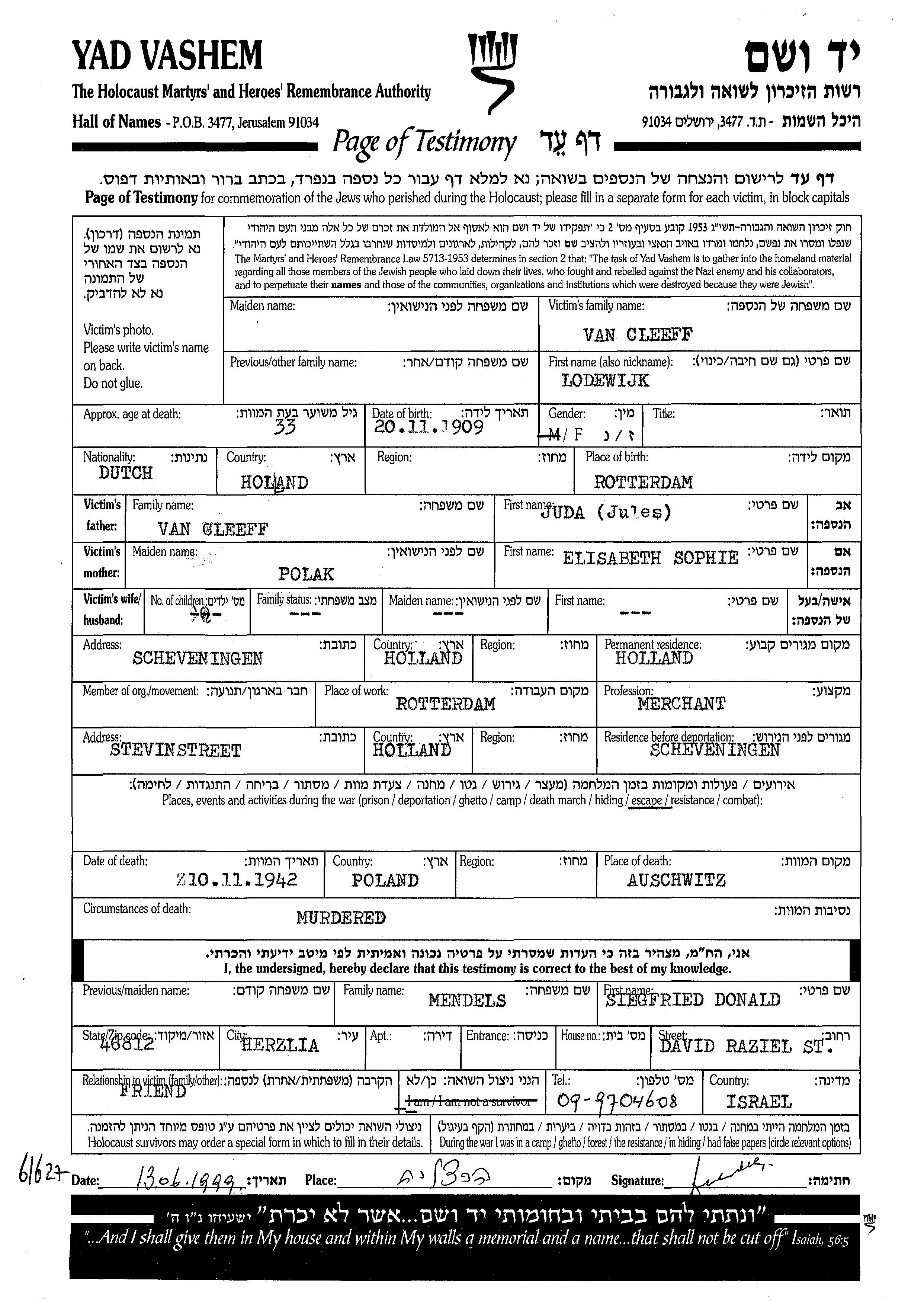 Cleeff van Lodewijk 1909 Rotterdam, Niederlande Liste von ermordeten Juden aus Holland