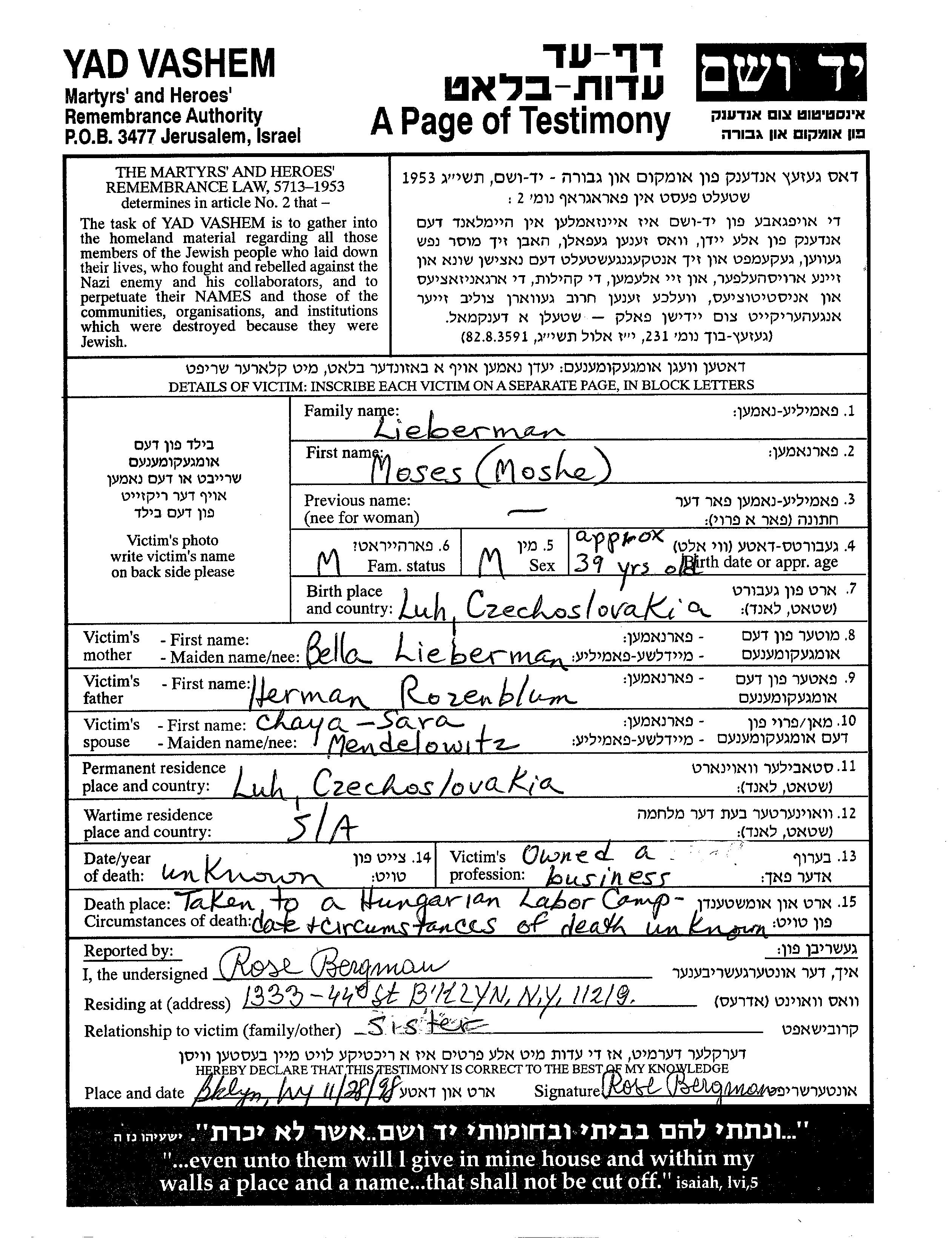 Moses Lieberman wurde in Luh, Tschechoslowakei geboren. Er war der Sohn von Herman und Bella. Er war mit Chaya Sara, geb. Mendelowitz Verheiratet. Vor dem Zweiten Weltkrieg lebte er in Luh, Tschechoslowakei. Während des Krieges war er in Luh, Tschechoslowakei.