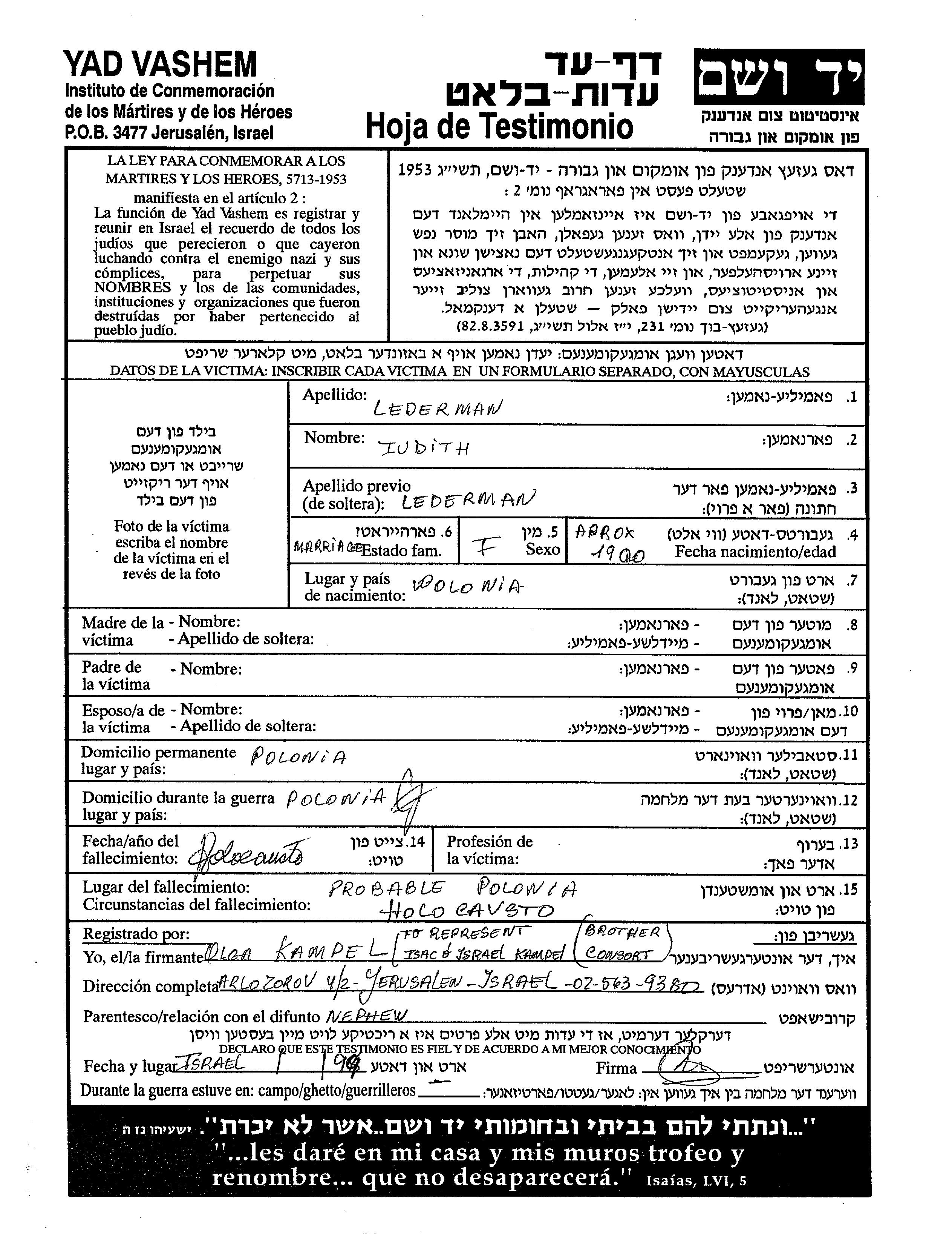 Iudith Lederman, geb. Lederman wurde im Jahr 1900 in Polen geboren. Sie war Verheiratet. Vor dem Zweiten Weltkrieg lebte sie in Polen. Während des Krieges war sie in Polen.