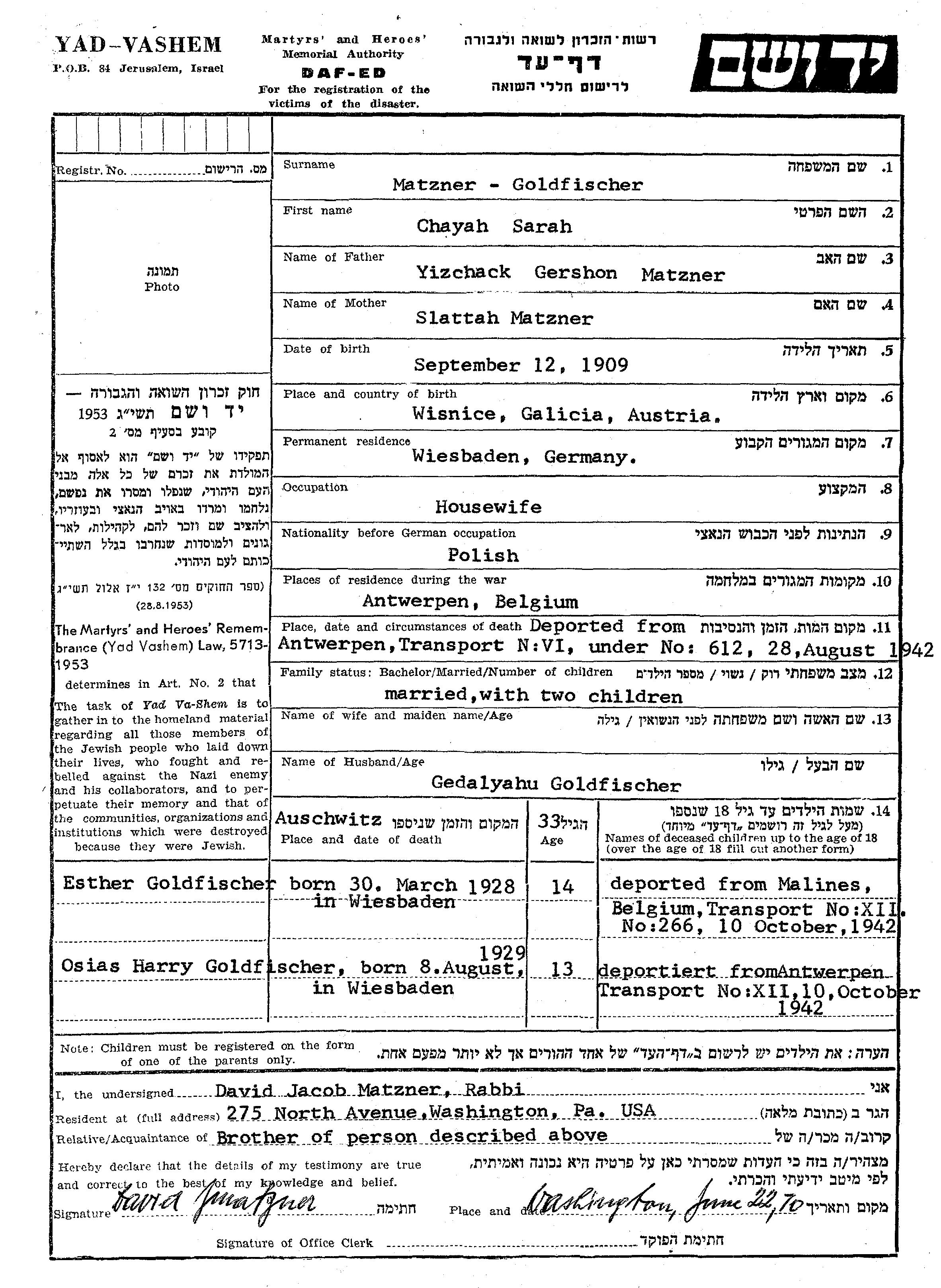 Goldfischer | Chaja | 1899 | Wisnicz, Polen | Liste von Deportierten |