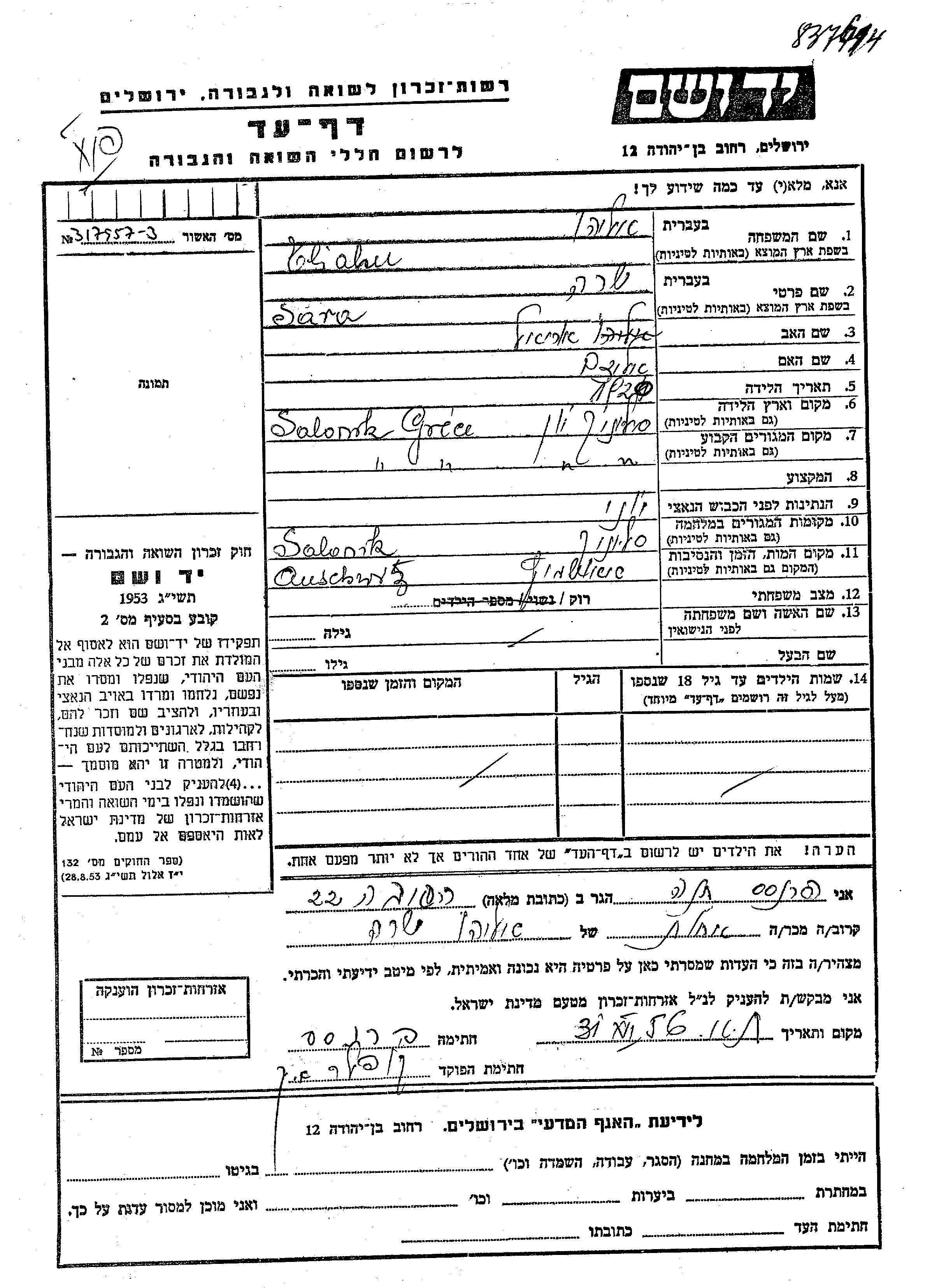 Sara wurde in der Schoah ermordet. Todesort: Auschwitz, Polen.