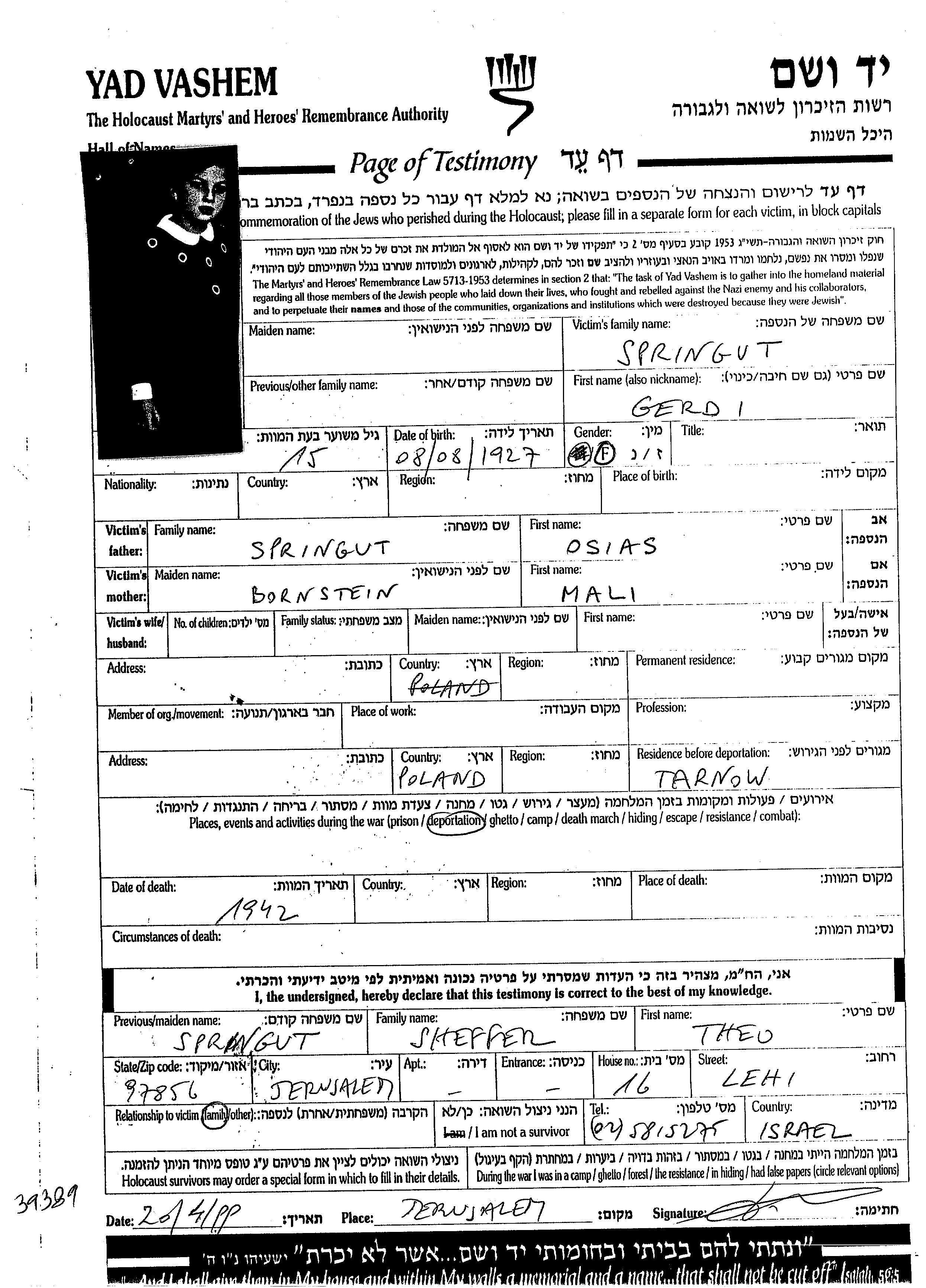 Gerdi Springut wurde im Jahr 1927 in Frankfurt am Main, Deutsches Reich geboren. Sie war Student. Vor dem Zweiten Weltkrieg lebte sie in Frankfurt am Main, Deutsches Reich.