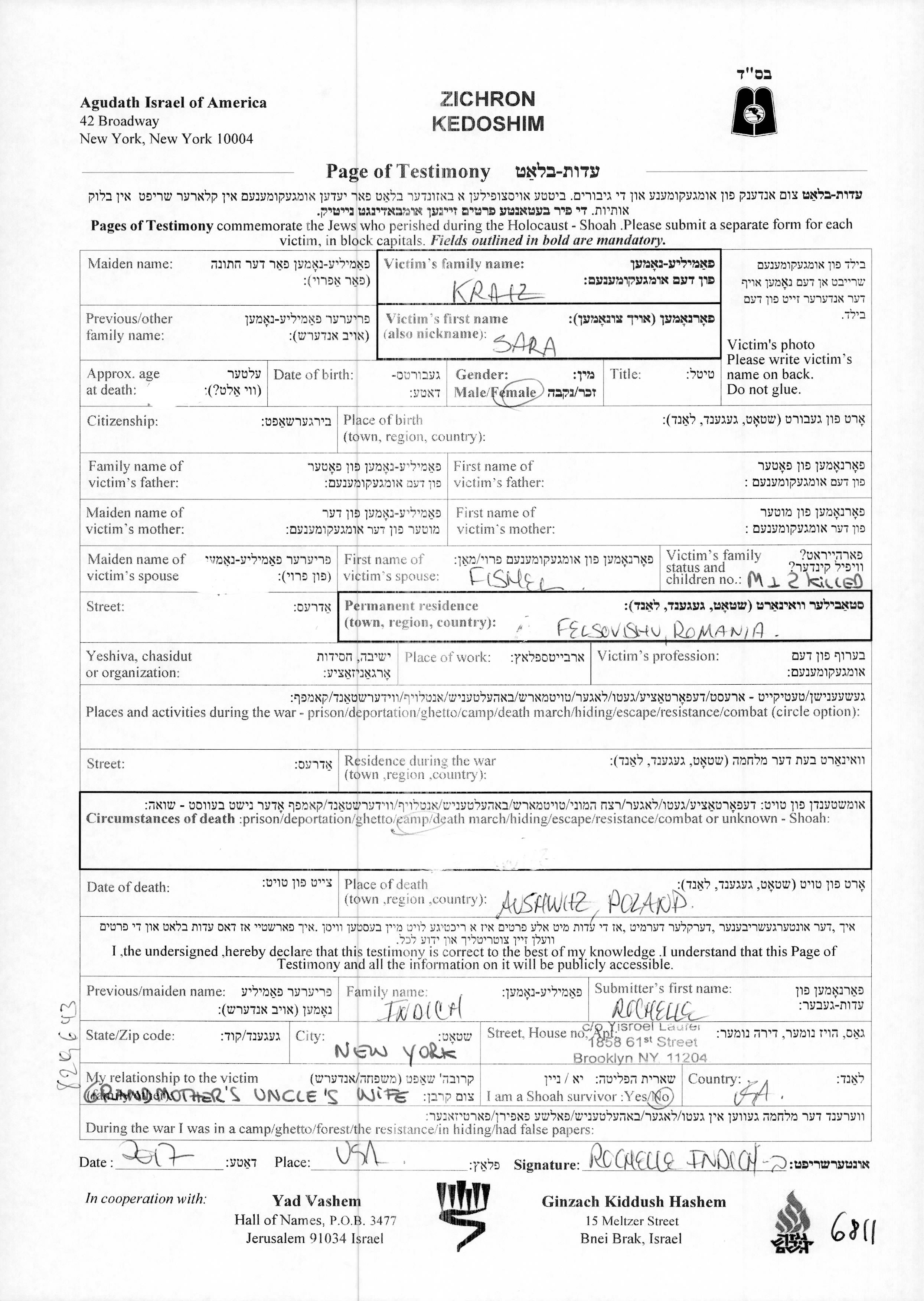 Sara Kraiz. Sie war mit Fishel Verheiratet. Vor dem Zweiten Weltkrieg lebte sie in Felsoviso, Rumänien.