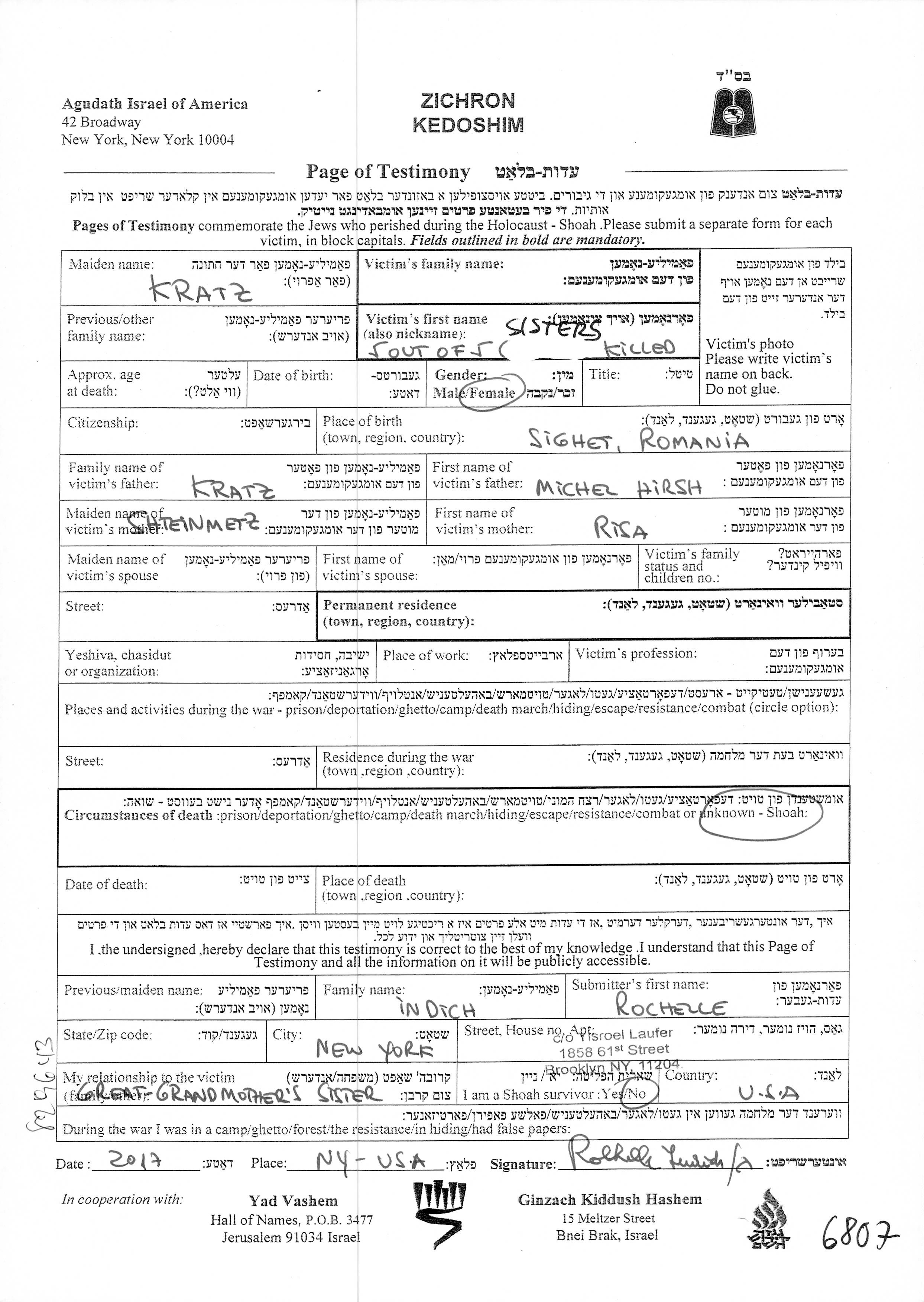 Vorname unbekannt Name unbekannt, geb. Kratz wurde in Maramarossziget, Rumänien geboren. Sie war die Tochter von Michel Hirsh und Risa, geb. Shteinmetz.