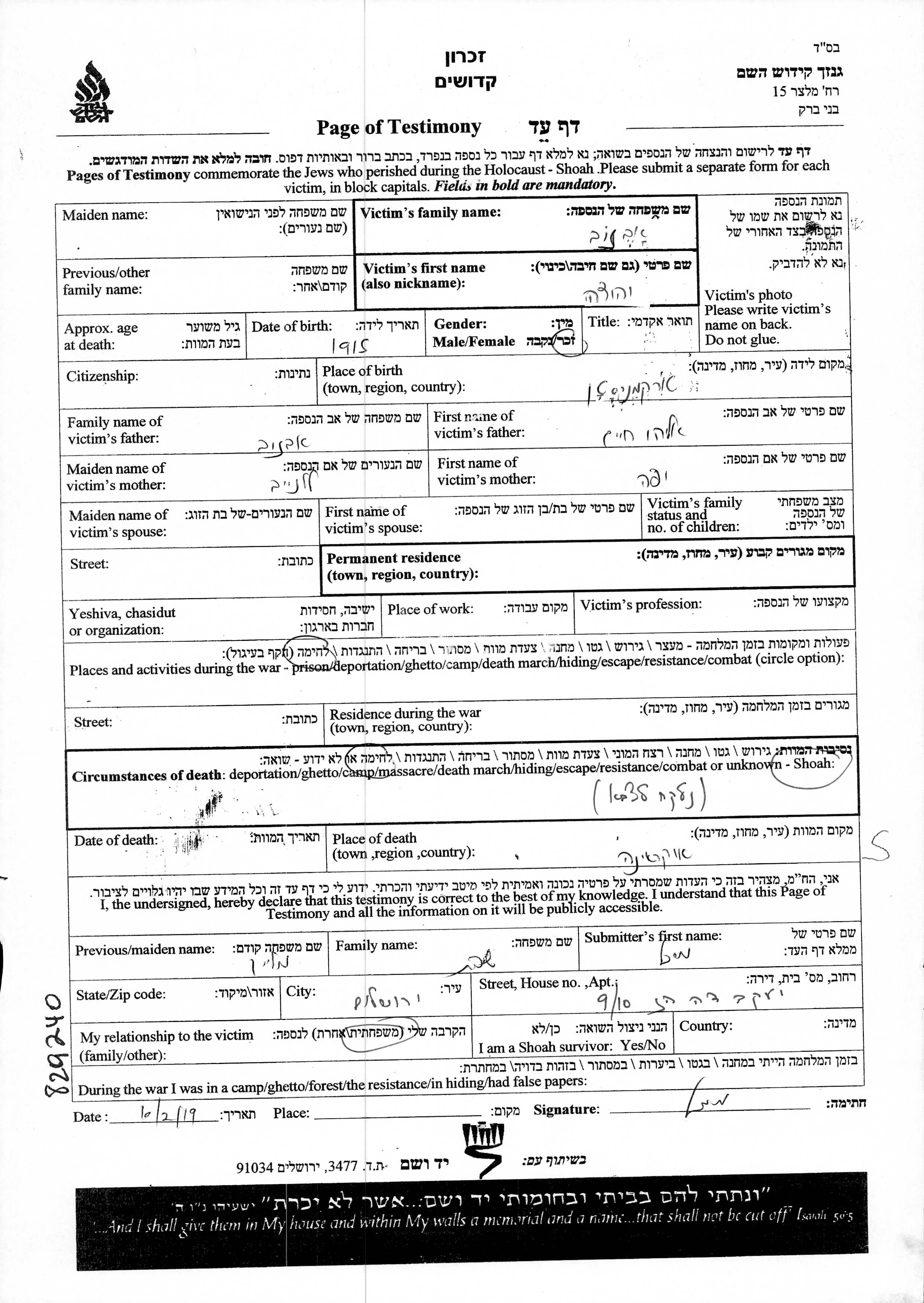 Yehuda Avazov wurde im Jahr 1915 in Turkmenistan (UdSSR) geboren. Er war der Sohn von Eliahu Chaim und Yafa, geb. Lalaneiev. Yehuda im Militärdienst umgekommen. Todesort: Ukraine (UdSSR).