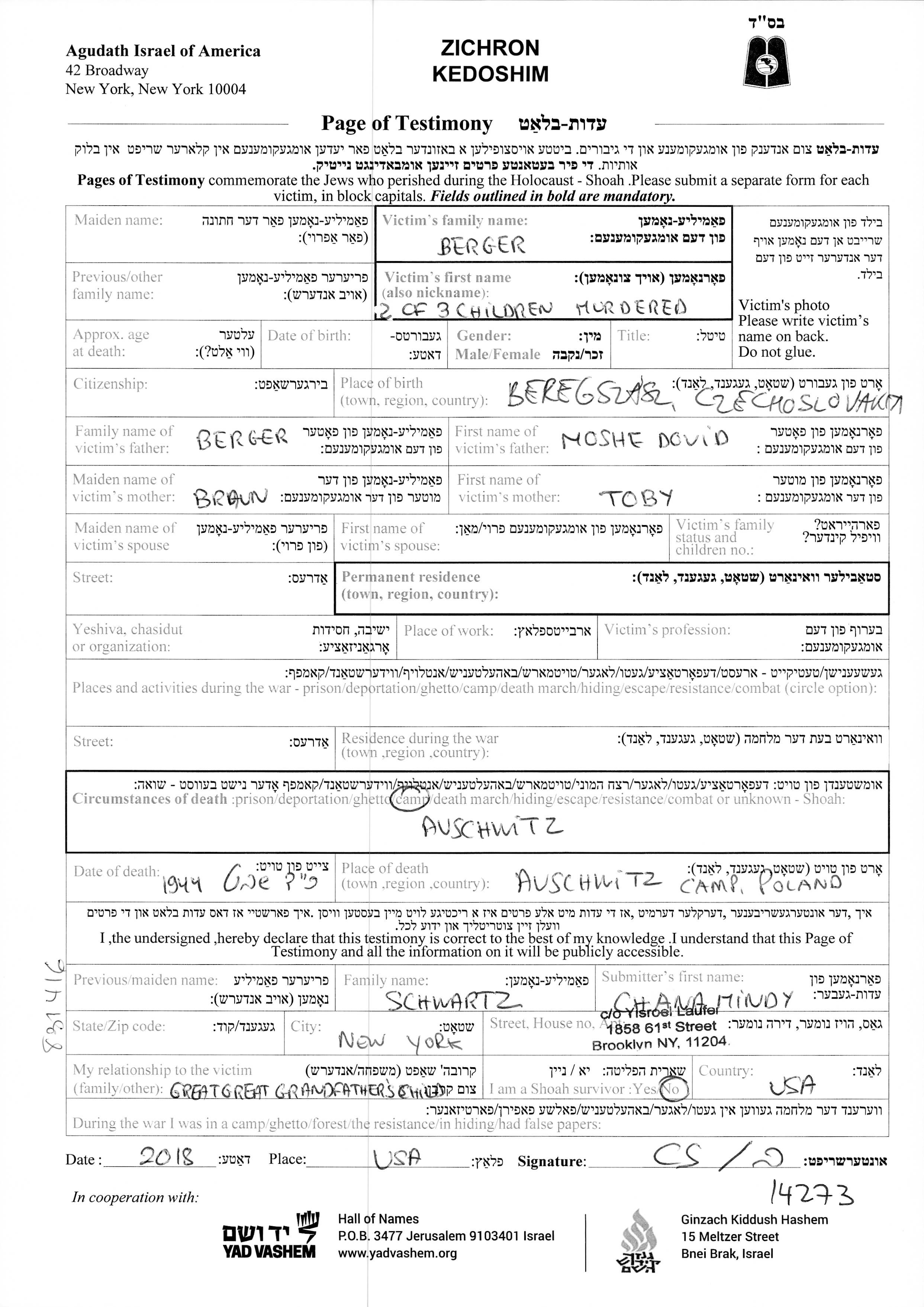 Vorname unbekannt Berger wurde in Beregszasz, Tschechoslowakei geboren. Er/sie war der/ die Sohn/Tochter von Moshe Dovid und Toby, geb. Braun. Er/Sie war Kind.