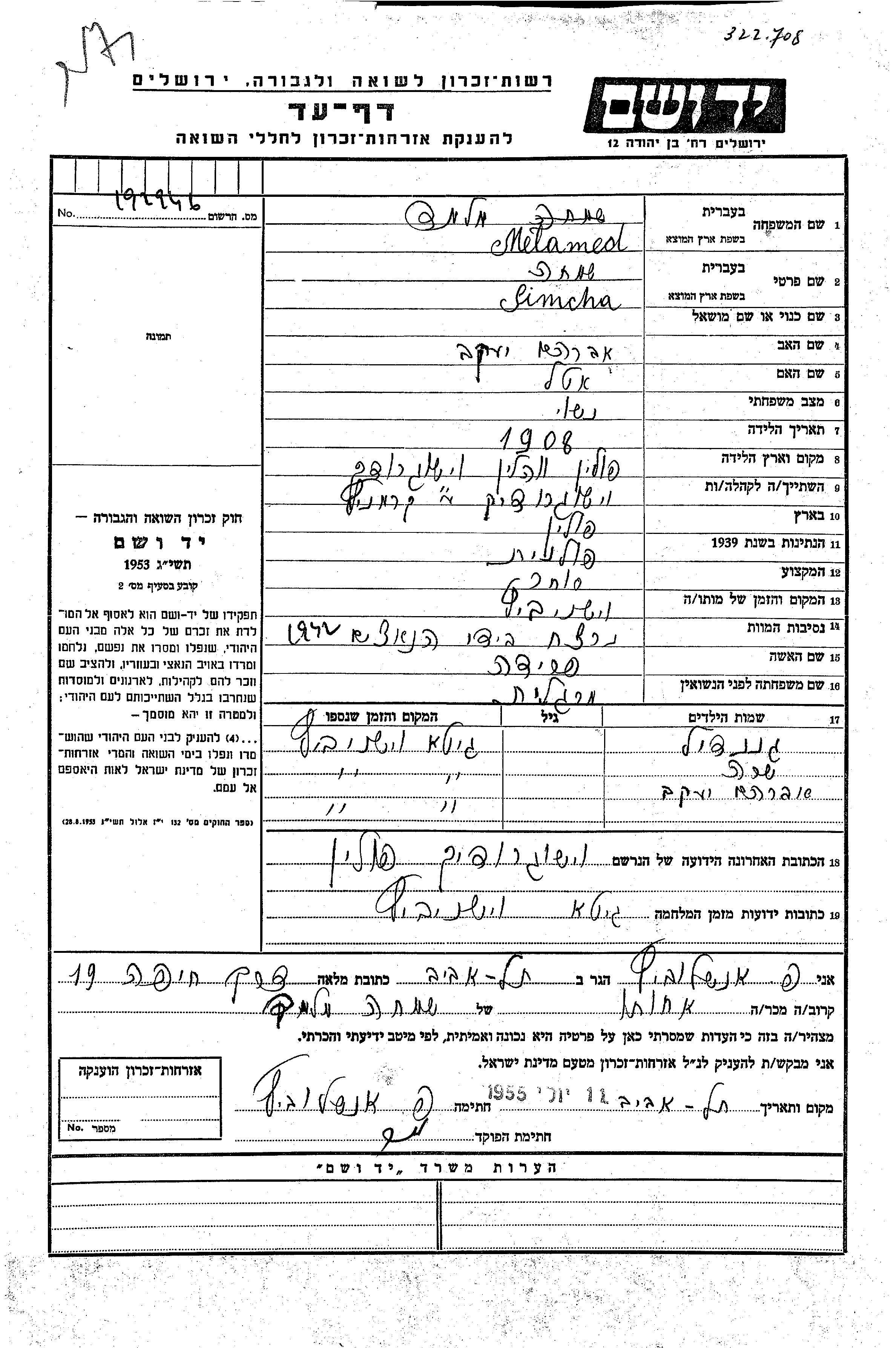 Simcha Melamed wurde im Jahr 1908 in Wyszogrodek, Polen geboren. Er war der Sohn von Avraham Yaakov und Etel. Er war Kaufmann/-frau und mit Frida, geb. Margalith Verheiratet. Vor dem Zweiten Weltkrieg lebte er in Wyszogrodek, Polen. Während des Krieges war er in Vishnevets, Polen.