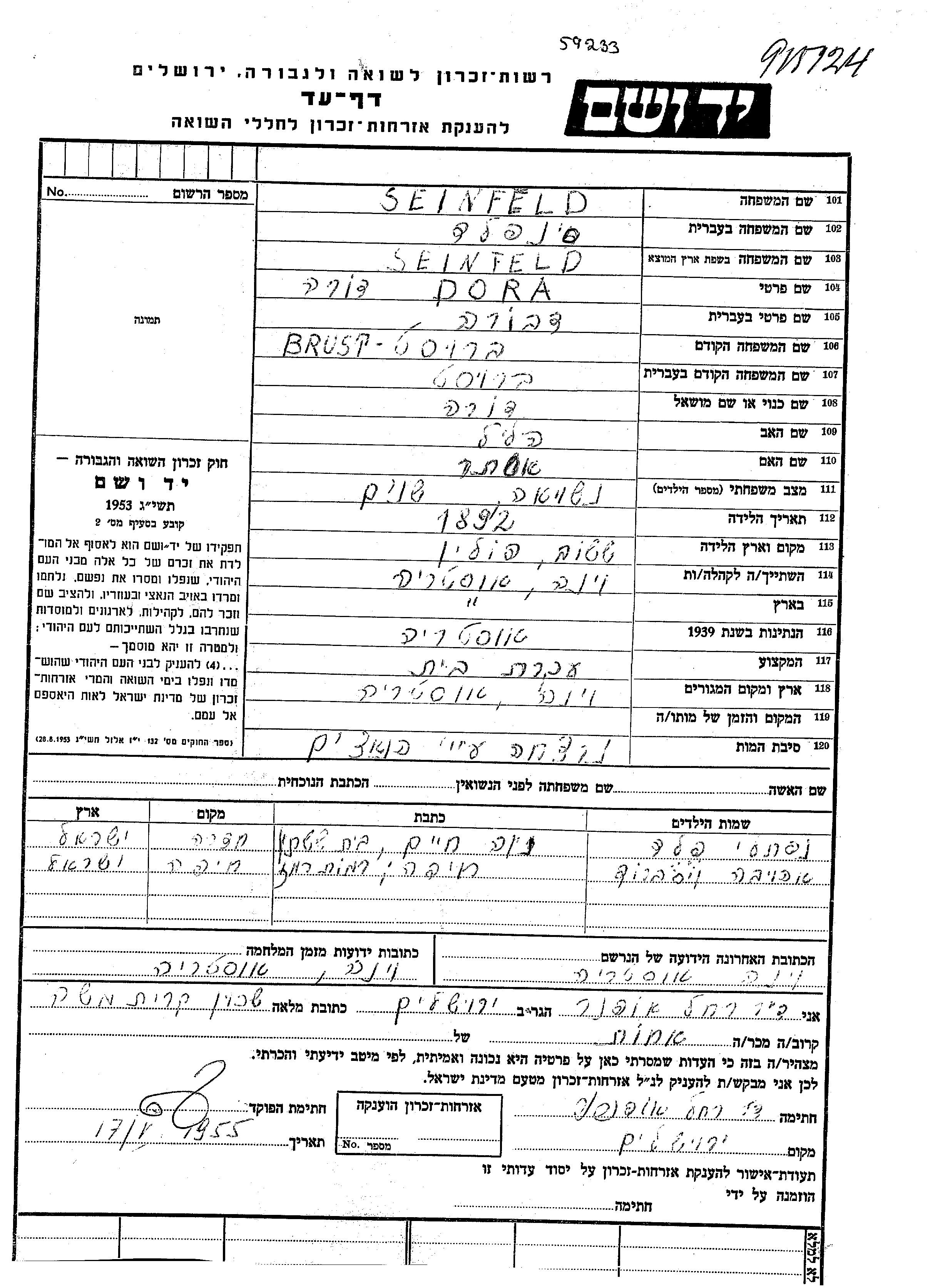 Dora Dvora Sheinfeld, geb. Brust wurde im Jahr 1892 in Sasow, Polen geboren. Sie war die Tochter von Hilel und Ester. Sie war Hausfrau und Verheiratet. Vor dem Zweiten Weltkrieg lebte sie in Vienna, Österreich. Während des Krieges war sie in Vienna, Österreich.