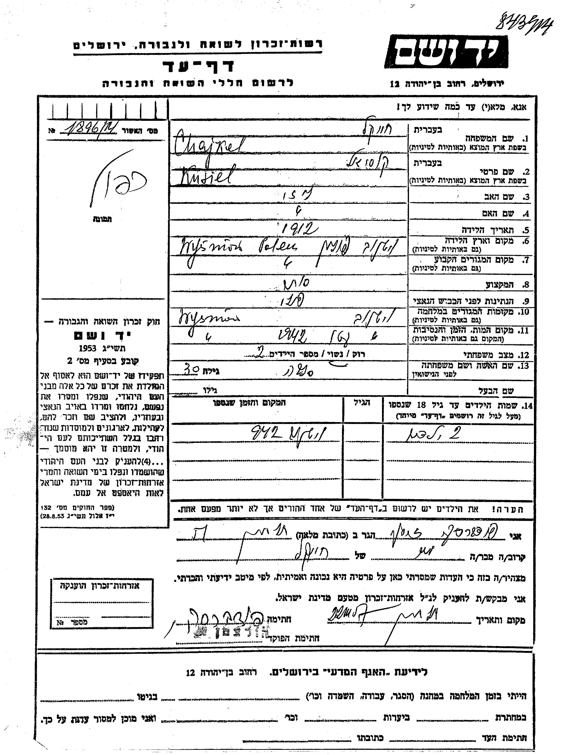 Kusiel Chajkel wurde im Jahr 1912 in Wiszniew, Polen geboren. Er war Kaufmann/-frau und mit Slava Verheiratet. Vor dem Zweiten Weltkrieg lebte er in Wiszniew, Polen. Während des Krieges war er in Wiszniew, Polen.