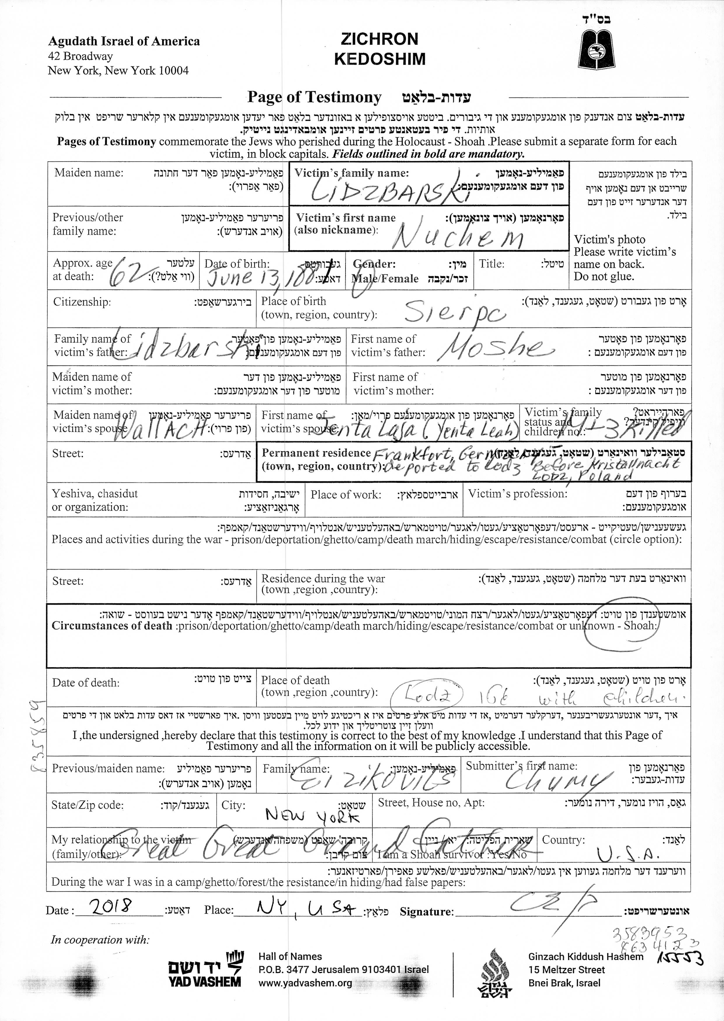 Lidzbarski Nakhum Lodz, Polen Aufzeichnungen ueber ermordete Personen