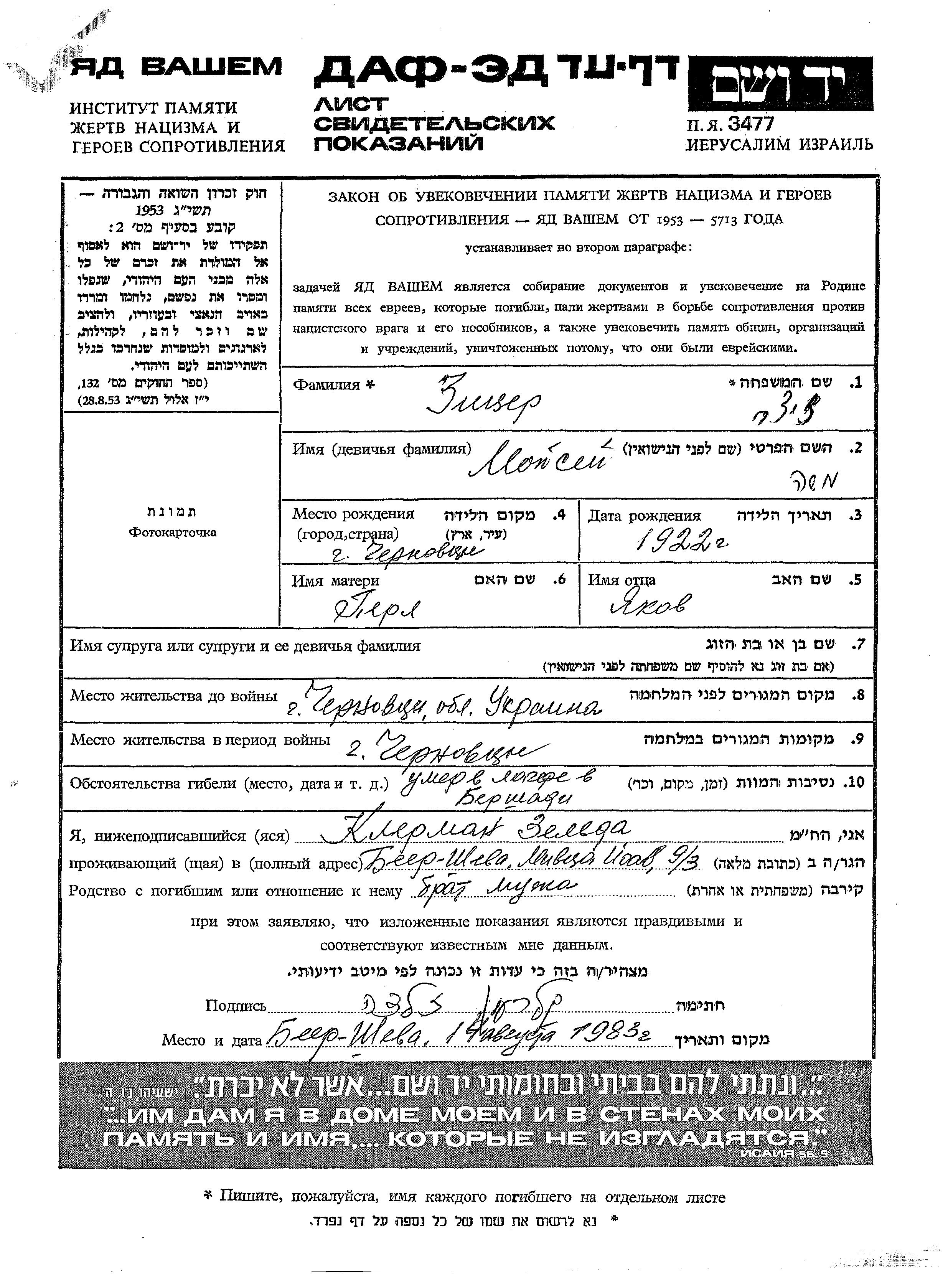 Moisei Zitzer wurde im Jahr 1922 in Czernowice, Rumänien geboren. Er war der Sohn von Yakov und Perl. Vor dem Zweiten Weltkrieg lebte er in Czernowice, Rumänien. Während des Krieges war er in Czernowice, Rumänien.