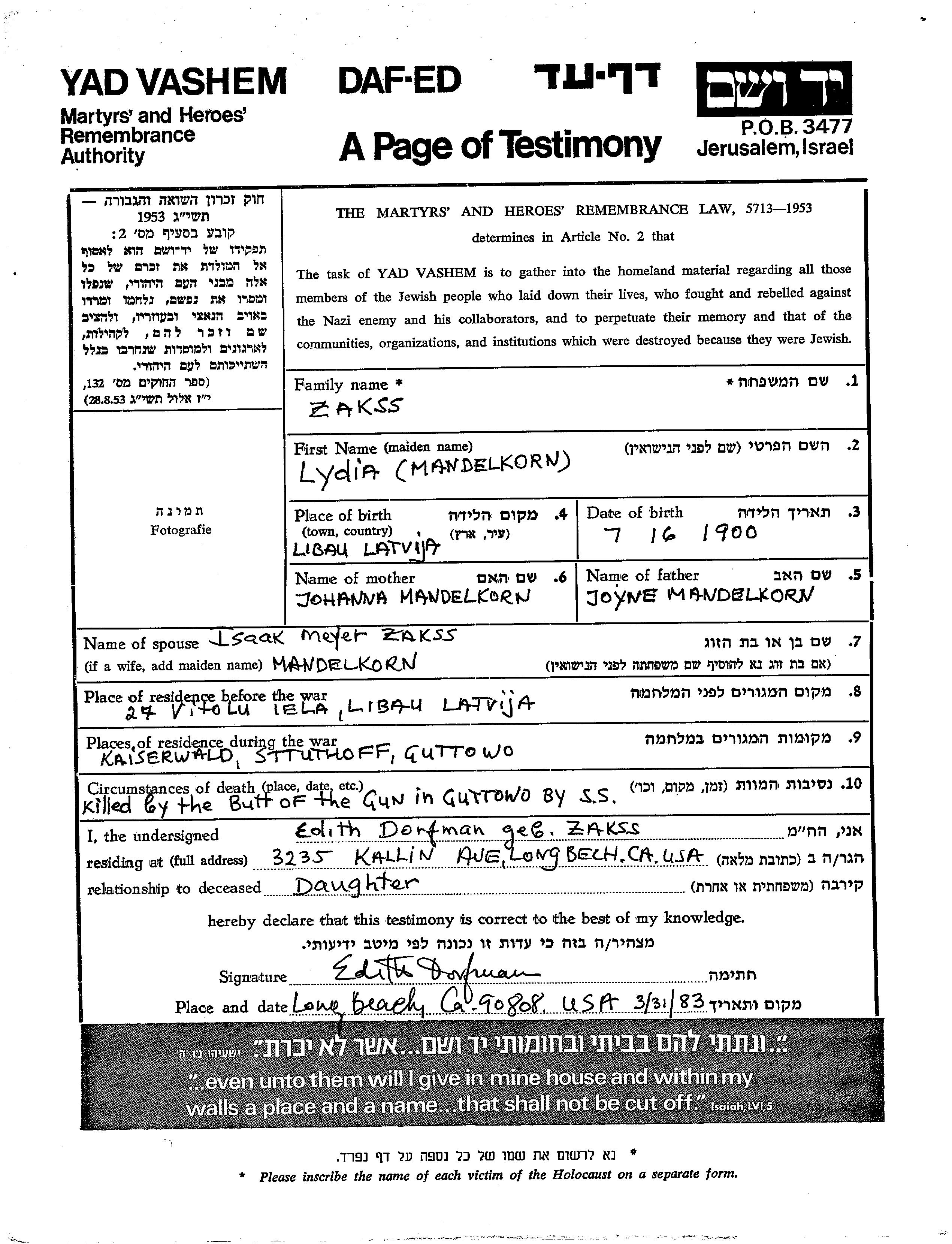 Lydia Zakss, geb. Mandelkorn wurde im Jahr 1900 in Libau, Lettland geboren. Sie war die Tochter von Joyne und Johanna. Sie war mit Isaac Verheiratet. Vor dem Zweiten Weltkrieg lebte sie in Libau, Lettland. Während des Krieges war sie in Stutthof, Freie Stadt Danzig.