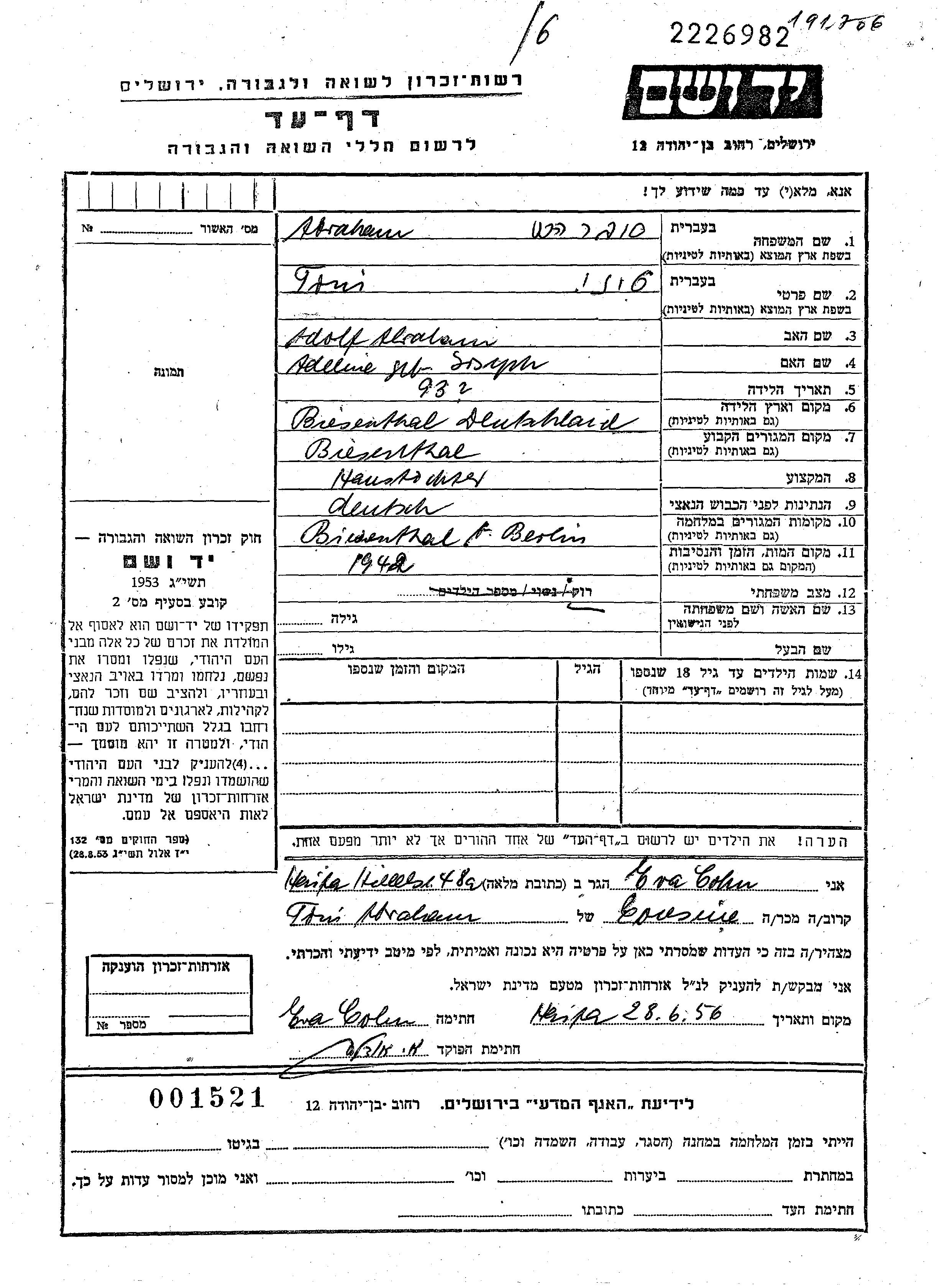 Abraham | Toni | 1893 | Biesenthal, Deutsches Reich | Gedenkblatt |