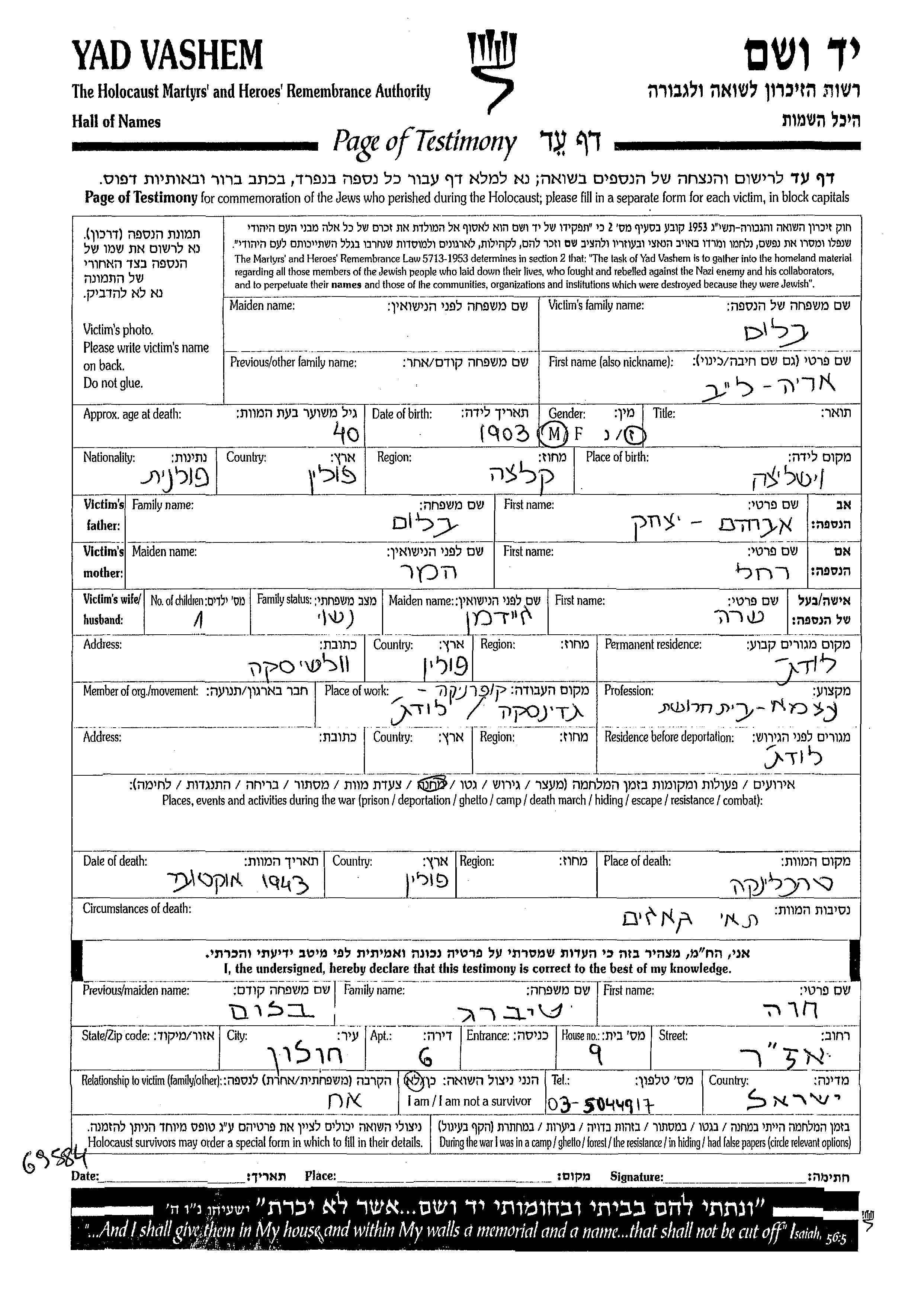 Blum Arie Leib 1903 Lodz, Polen Gedenkblatt