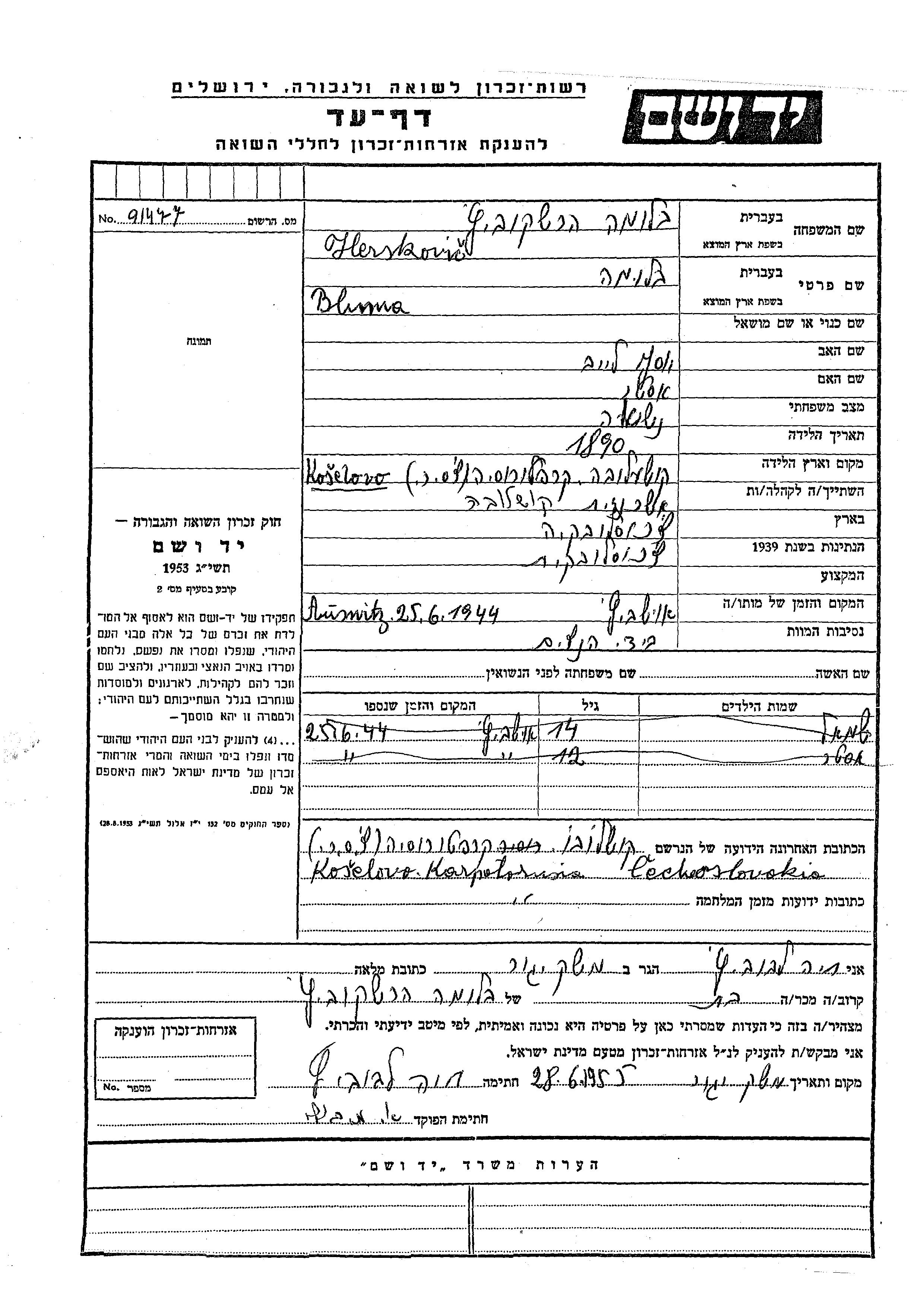 Herskovits | Bluma | 1893 | Koselovo, Tschechoslowakei | Gedenkblatt |