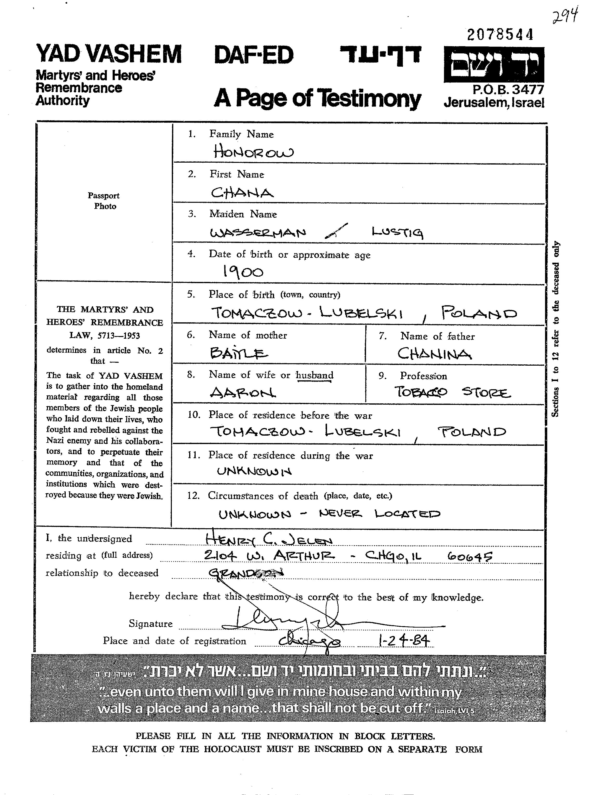 Khana Honarow, geb. Lustig Wasserman wurde im Jahr 1897 in Tomaszow Lubelski, Polen geboren. Vor dem Zweiten Weltkrieg lebte sie in Tomaszow Lubelski, Polen.