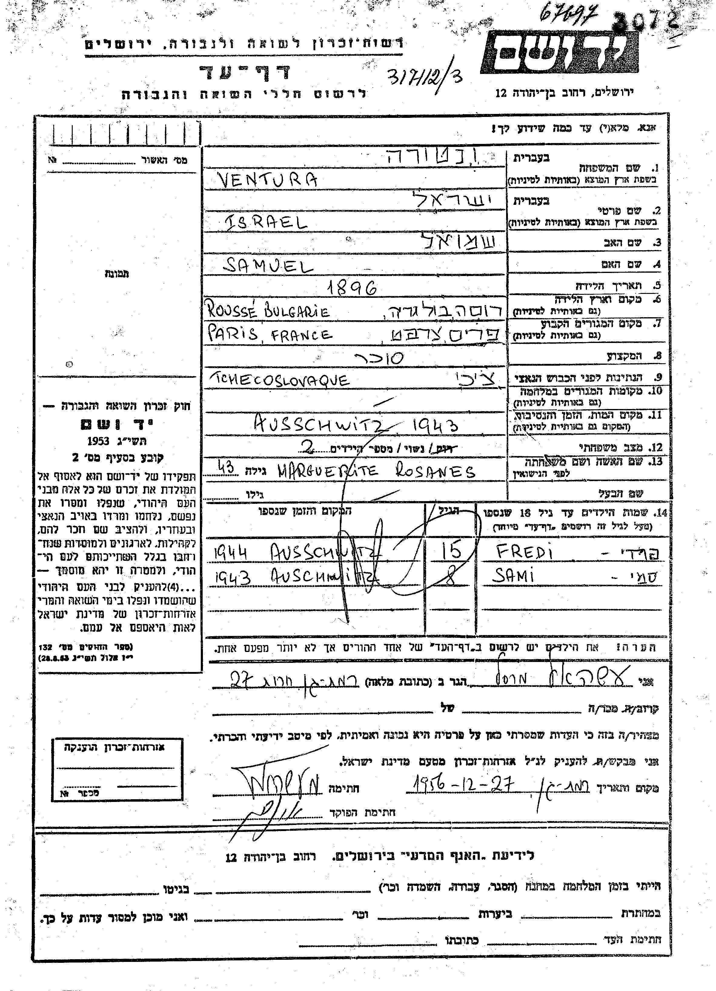 Yisrael Ventura wurde im Jahr 1895 in Ruse, Bulgarien geboren. Er war Kaufmann/-frau. Vor dem Zweiten Weltkrieg lebte er in Paris, Frankreich.