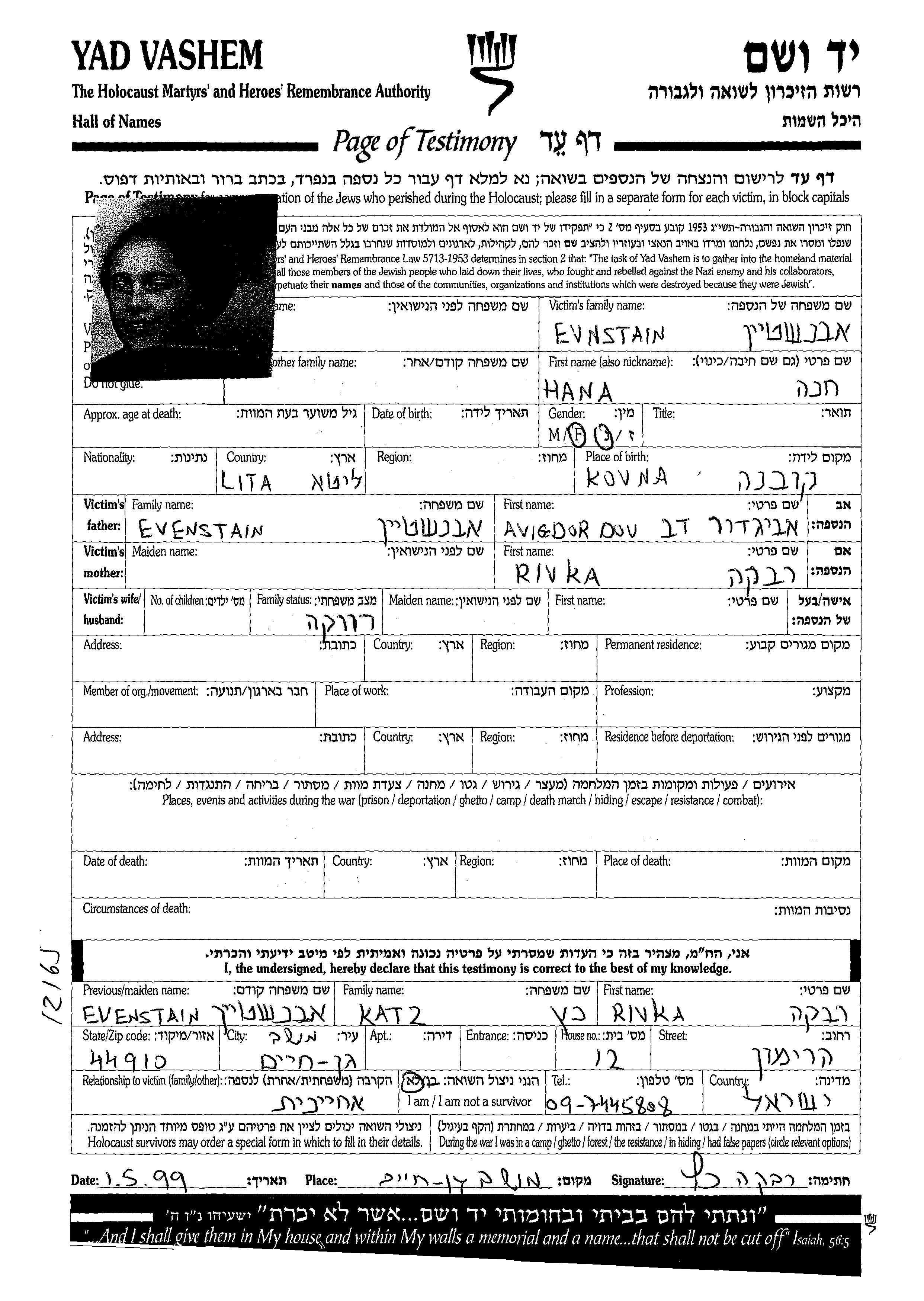 Khana Evnstain wurde im Jahr 1920 in Kaunas, Litauen geboren. Vor dem Zweiten Weltkrieg lebte sie in Kowna, Litauen.