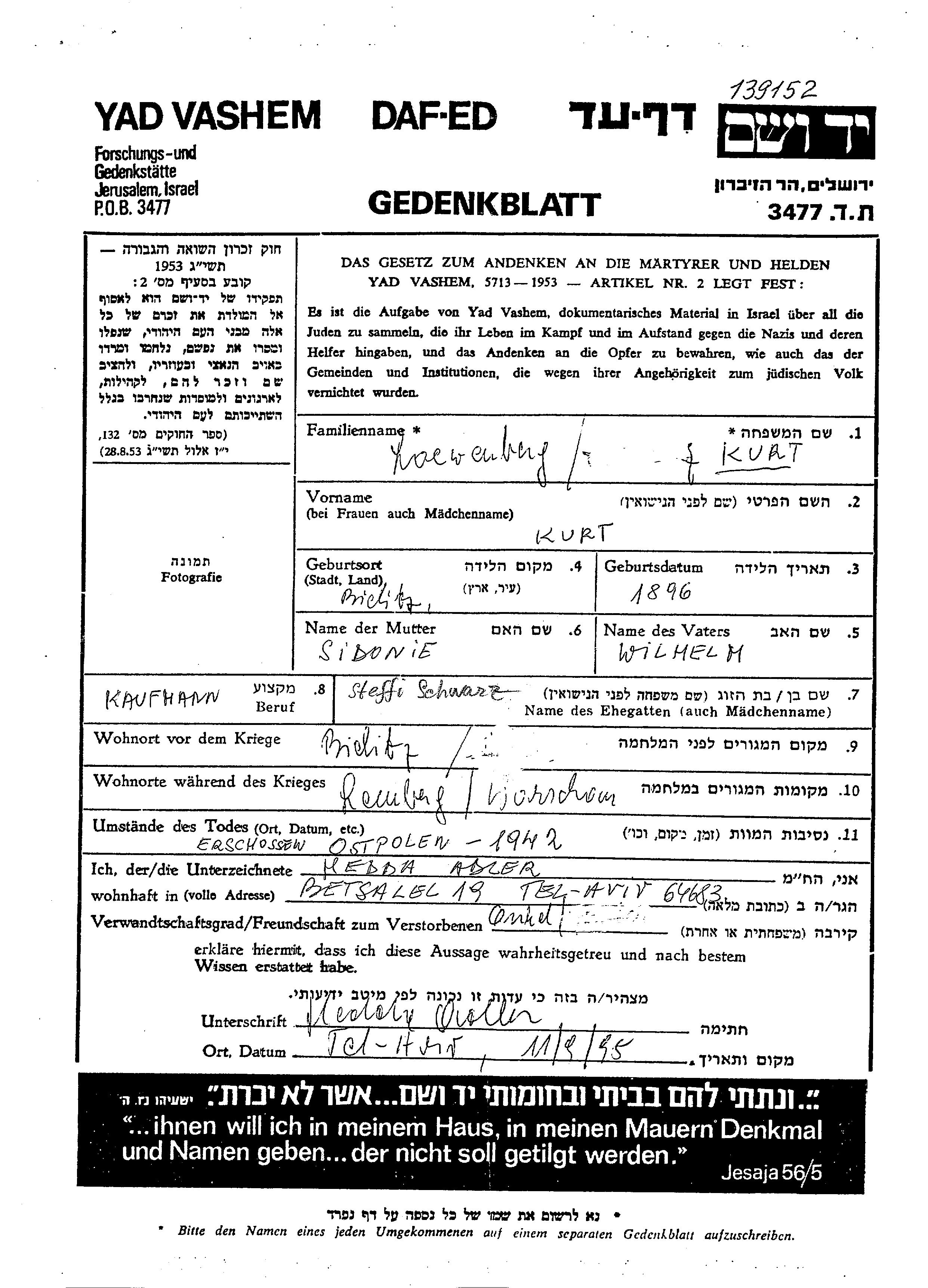 Kurt wurde in der Schoah ermordet. Todesort: unbekannt im Jahr 1942.
