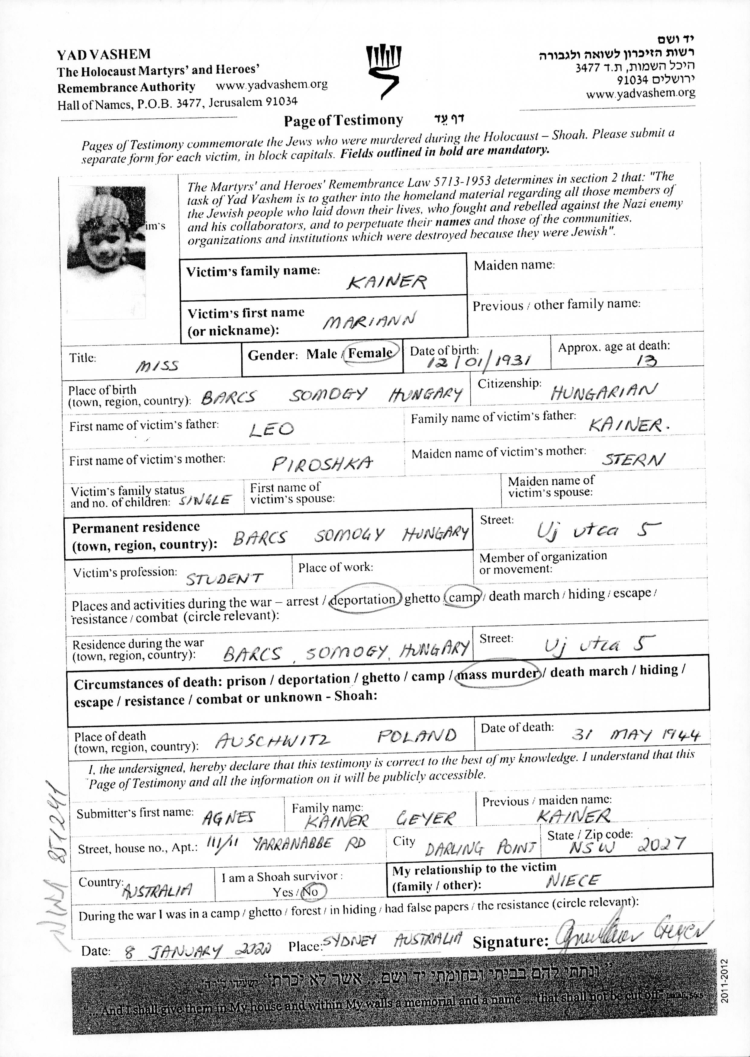 Kainer Mariann 1931 Barcs, Ungarn Gedenkblatt