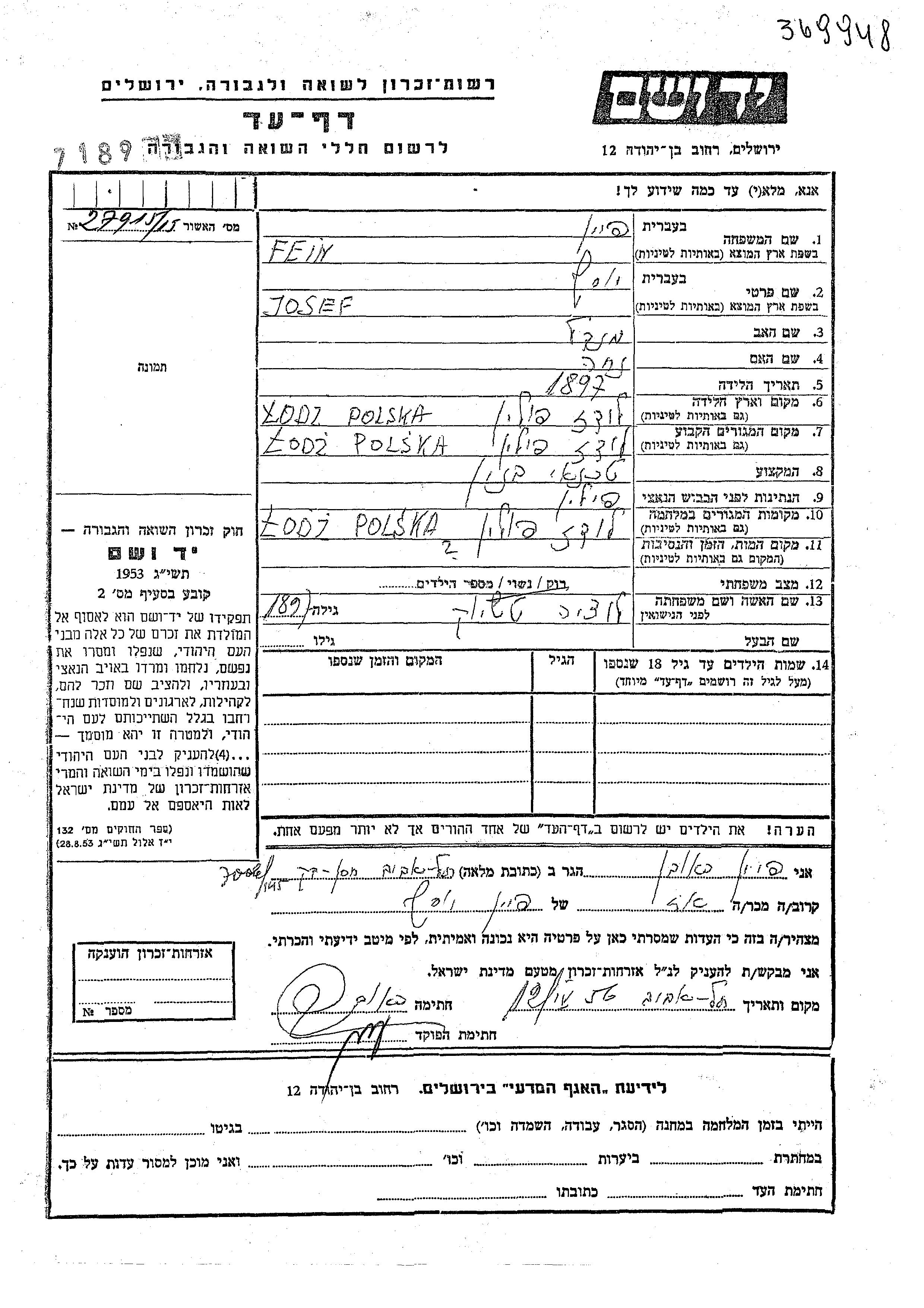 Yosef Fein wurde im Jahr 1897 in Lodz, Polen geboren. Er war Bautechniker. Vor dem Zweiten Weltkrieg lebte er in Lodz, Polen.