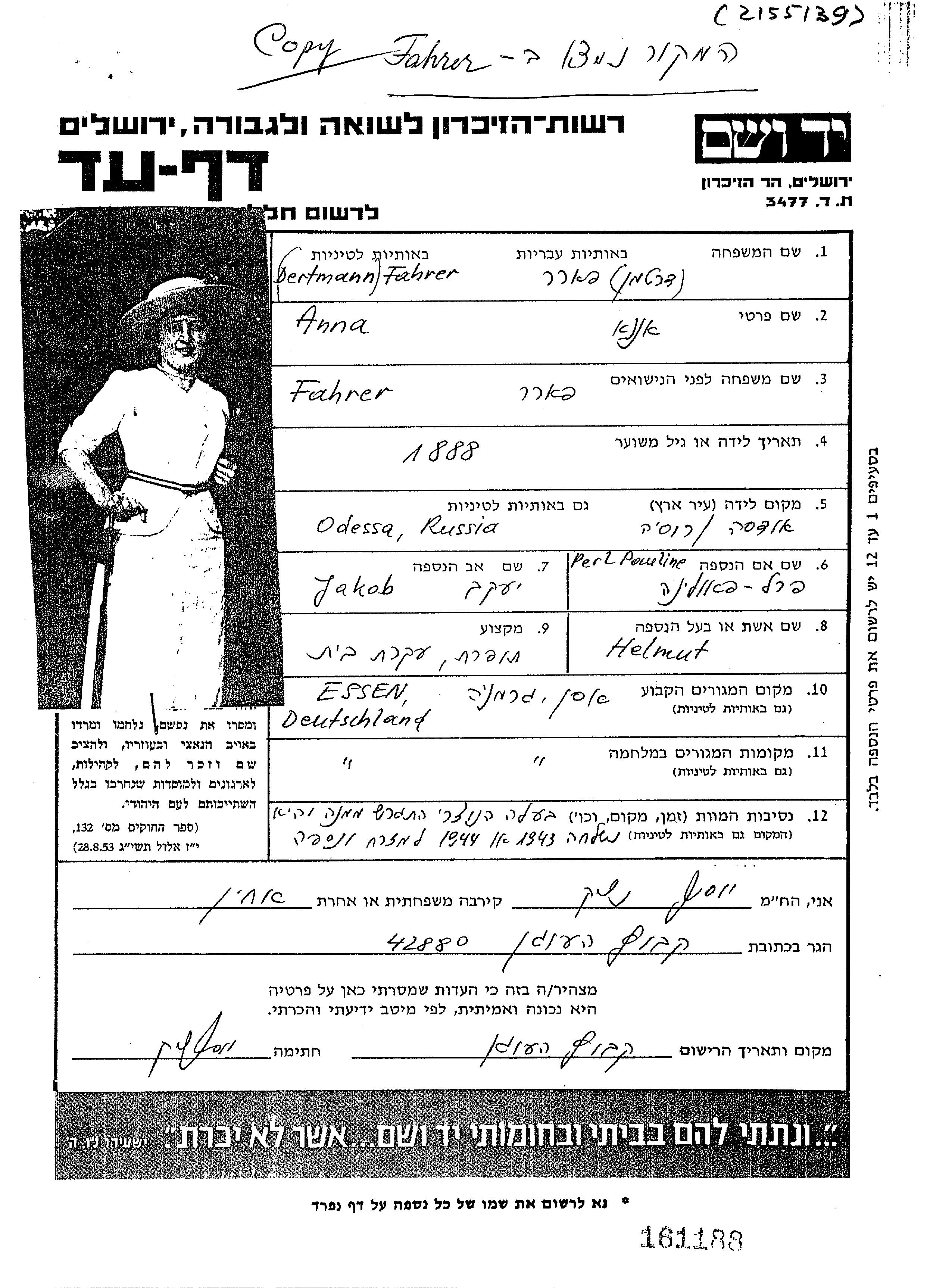 Ana Fahrer Dertmann Teiman, geb. Fahrer wurde im Jahr 1888 in Odessa, Ukraine (UdSSR) geboren. Sie war Schneiderin. Vor dem Zweiten Weltkrieg lebte sie in Essen, Deutsches Reich.