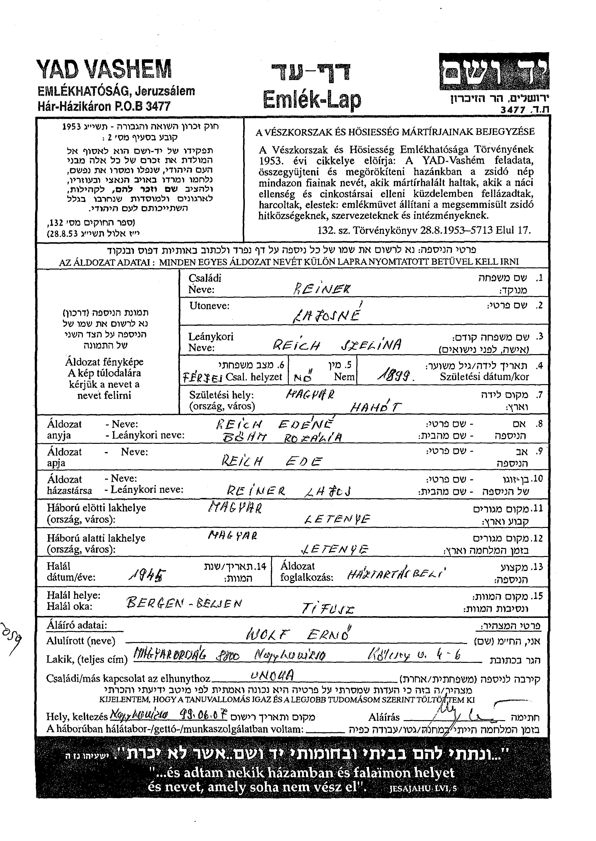 Szelina Reiner, geb. Reich wurde im Jahr 1899 in Hahot, Ungarn geboren. Sie war Hausfrau. Vor dem Zweiten Weltkrieg lebte sie in Letenye, Ungarn.