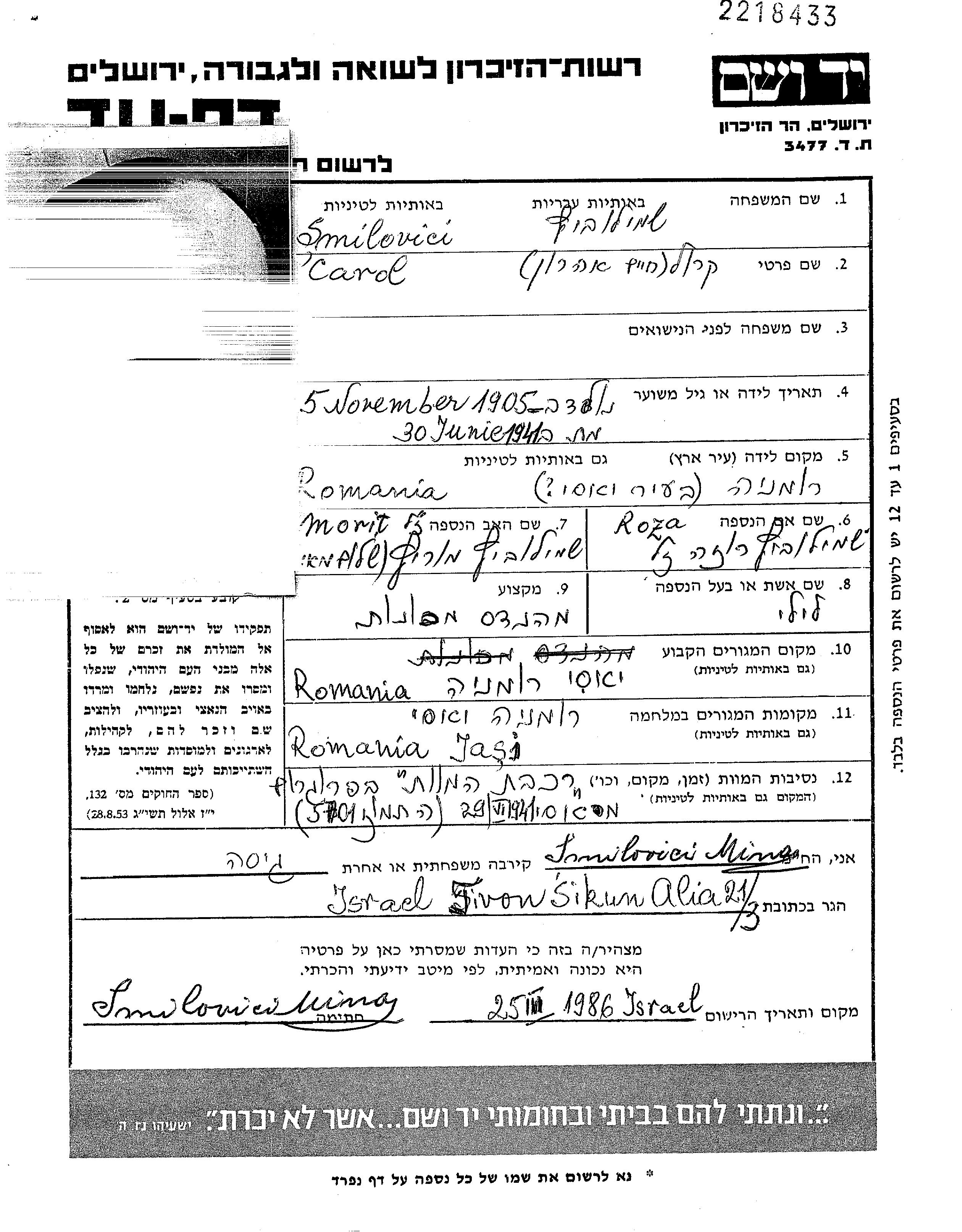 Carol Aharon Khaim Smilovici wurde im Jahr 1903 in Iasi, Rumänien geboren. Er war Ingenieur. Vor dem Zweiten Weltkrieg lebte er in Iasi, Rumänien.