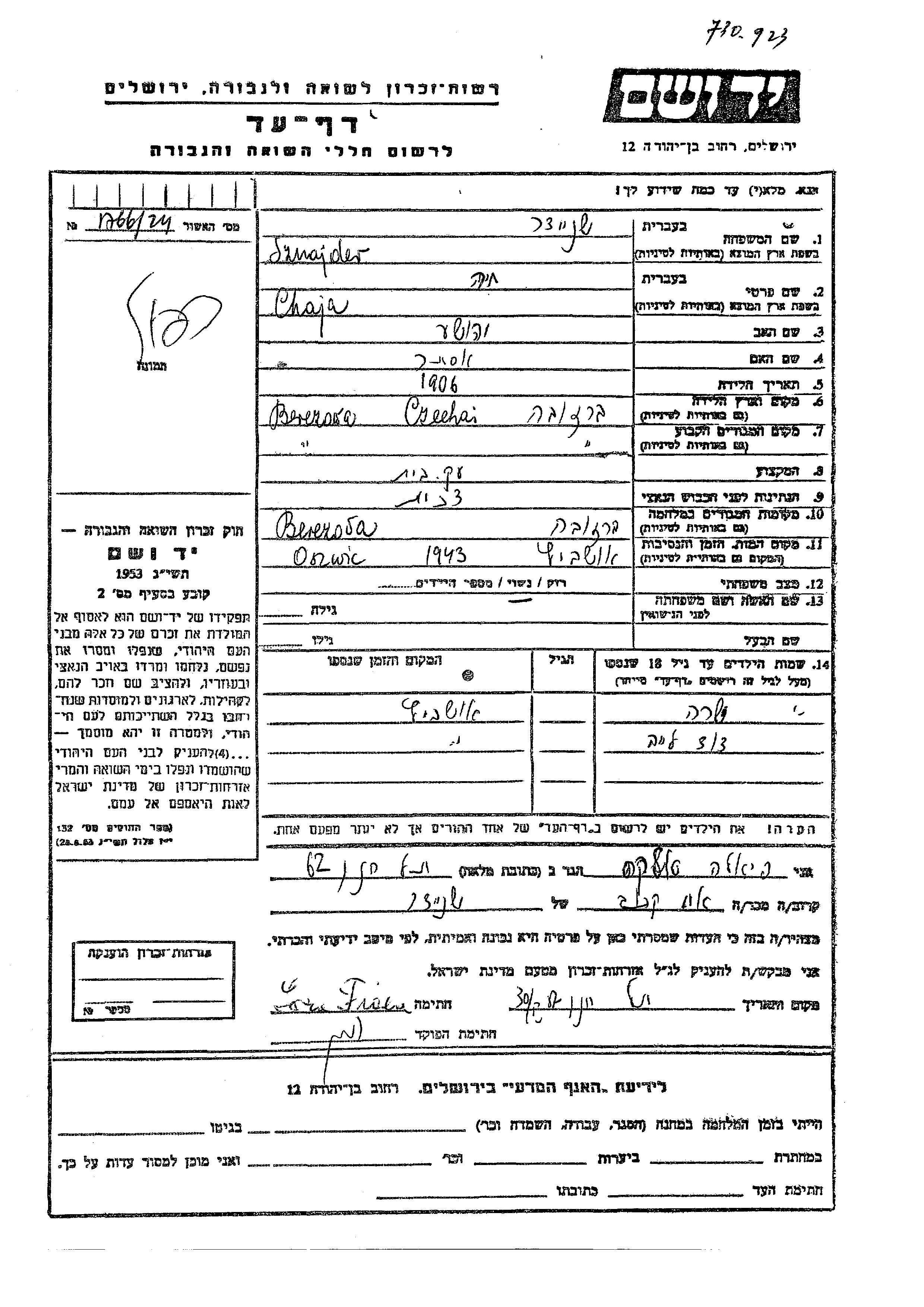 Sznajder | Chaja | 1906 | Berezove, Tschechoslowakei | Gedenkblatt |
